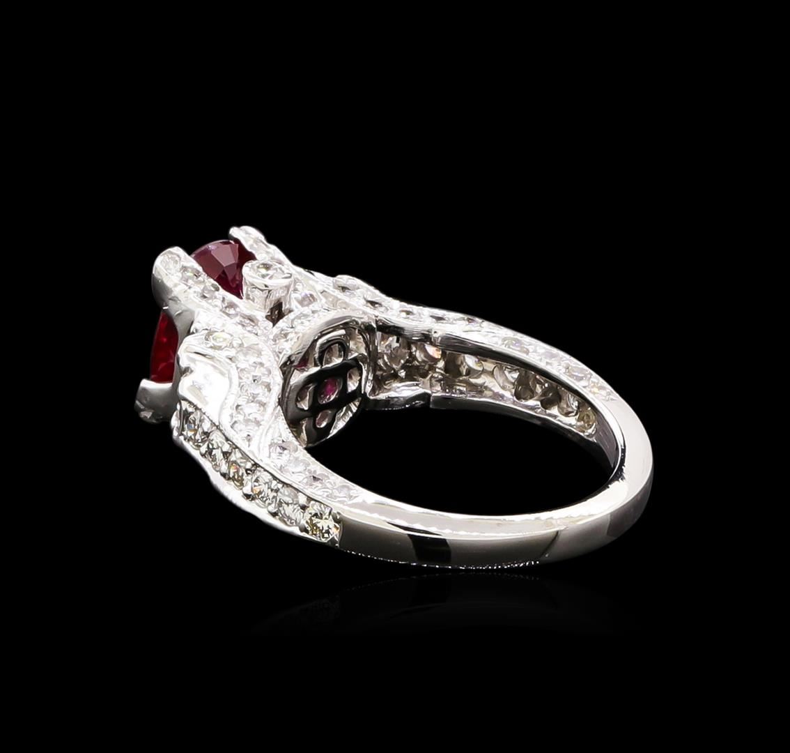 One electronically tested 18KT white gold ladies cast ruby and diamond ring. The featured ruby is set within diamond set prongs supported by a diamond under gallery and stylized diamond set shoulders, completed by a two millimeter wide band. Bright polish finish with milgrain detailing. Identified with markings of "18K". Condition is new, good workmanship. Containing: One prong set oval mixed cut natural ruby, measuring 8.50 x 6.00 x 2.50mm, approximate weight of 1.07ct., clarity is heavily included, type II, medium dark, moderately strong, slightly purplish red color, (GIA slpR 6/4), cut is good. Transmitting light somewhat diffusely, transparent to translucent. Naturally occurring internal & external characteristics are present. Graded in the setting. Four prong set baguette cut (tapered) diamonds, measuring from 2.40 x 2.20 x 1.54mm (depth est.) to 3.50 x 2.90 x 2.03mm (depth est.) approximate total weight of 4 Stones = 0.60ct. Graded in the setting. Clarity: VS-1 to VS-2. Color: H - I Fourteen prong set round brilliant cut diamonds, measuring 1.90 - 1.90 x 1.14mm (depth est.) approximate total weight of 14 Stones = 0.40ct. Graded in the setting. Clarity: SI-1 to I-1. Color: G - I Sixty-Eight prong set round brilliant and single cut diamonds, measuring 1.40 x 0.90 x 0.00mm (depth est.) approximate total weight of 68 Stones = 0.59ct. Graded in the setting. Clarity: SI-2 to I-2. Color: G - I. Total Weight of Colored Stones 1.07ct. Total Weight of Diamonds 1.59ct. Total Weight of Ring 6.23gm. AIG Appraised at $7,380.00.