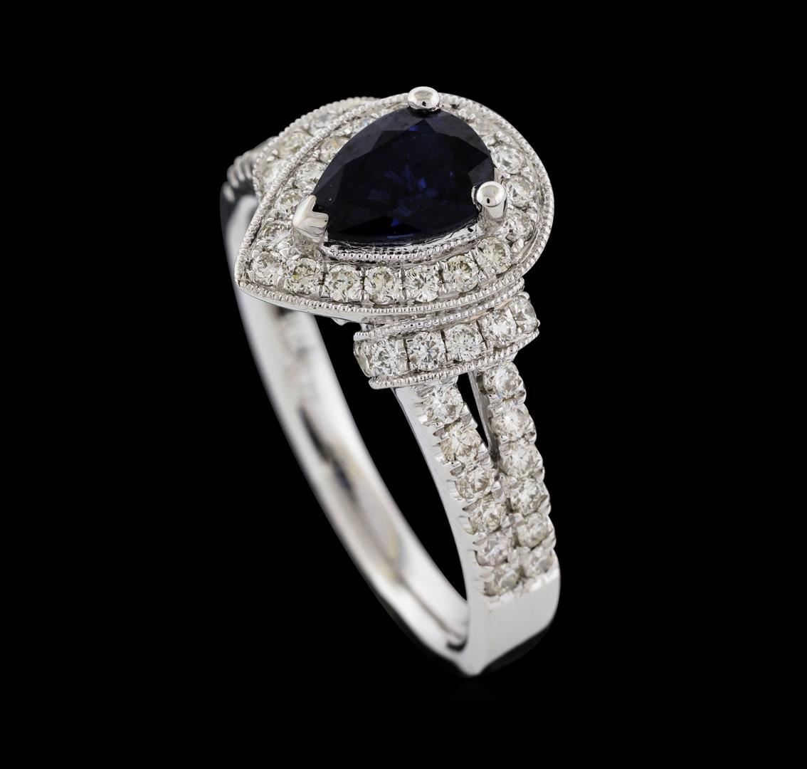One electronically tested 14KT white gold lady's cast fashion ring with a split shank halo with a bright polish with milgrain detailing finish. The featured lady's ring has diamond set cuffs and a shank measuring 2.25 millimeters wide. Identified with markings of '14K'. Condition is new, good workmanship. Containing: One prong set pear modified brilliant cut natural blue sapphire, measuring 7.05 x 5.50 x 3.56mm, (depth est.) approximate weight of 1.07ct., clarity is eye clean, medium dark, strong, blue color, (GIA B 6/5), cut is very good. Transmitting light with no distortion, transparent. Colored gemstones are presumed to have been subjected to commonly used enhancement processes. Graded in the setting. Two bezel set round brilliant cut diamonds, measuring 2.10 - 2.00 x 1.27mm (depth est.) approximate total weight of 2 Stones = 0.07ct. Graded in the setting. Clarity SI-1 to SI-2. Color: G - H Cut Very Good Sixty bead set round brilliant cut diamonds, measuring 1.50 - 1.40 x 0.87mm (depth est.) approximate total weight of 60 Stones = 0.66ct. Graded in the setting. Clarity SI-1 to SI-2. Color: H - I Cut Good. Total Weight of Colored Stones 1.07ct.. Total Weight of Diamonds 0.73ct.. Total Weight of Ring 5.00gm. GAS Appraised at $6,655.00.
