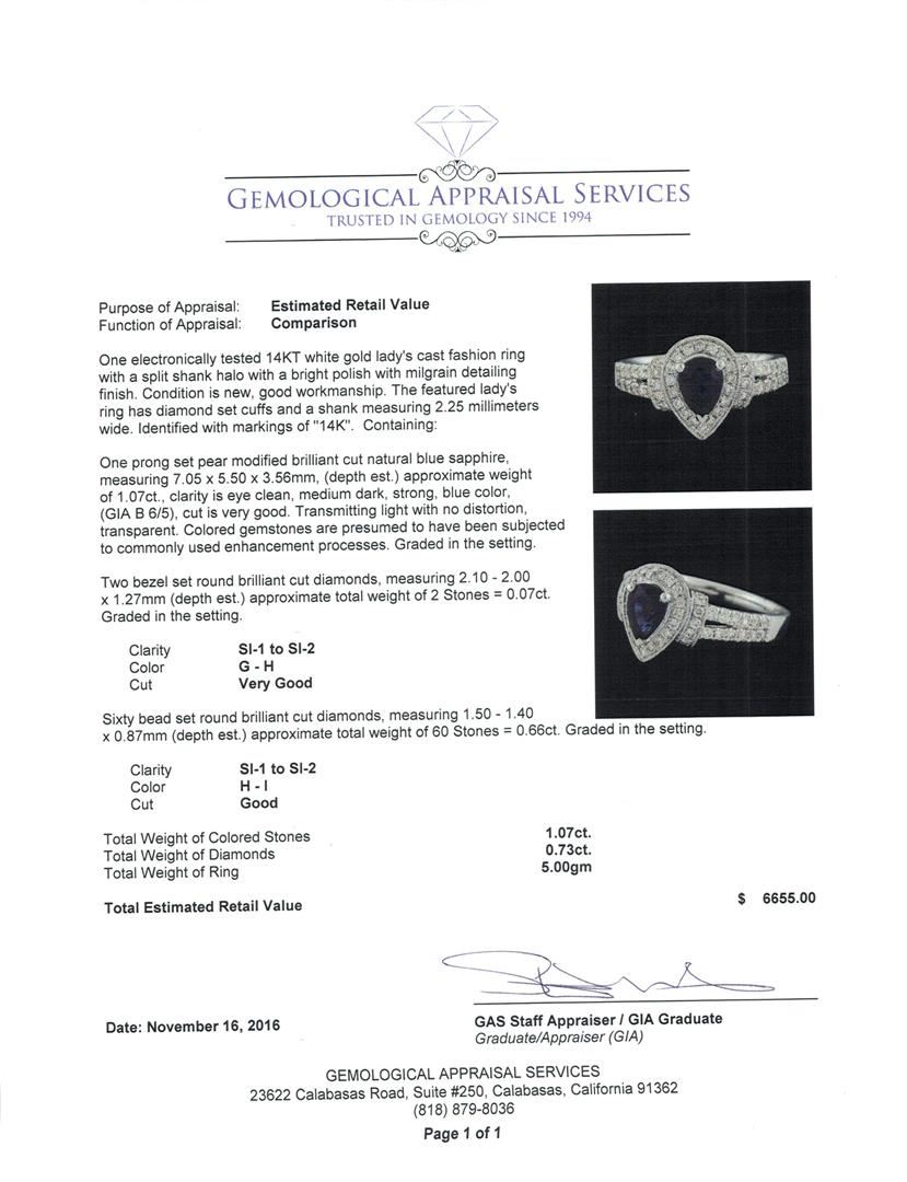 One electronically tested 14KT white gold lady's cast fashion ring with a split shank halo with a bright polish with milgrain detailing finish. The featured lady's ring has diamond set cuffs and a shank measuring 2.25 millimeters wide. Identified with markings of '14K'. Condition is new, good workmanship. Containing: One prong set pear modified brilliant cut natural blue sapphire, measuring 7.05 x 5.50 x 3.56mm, (depth est.) approximate weight of 1.07ct., clarity is eye clean, medium dark, strong, blue color, (GIA B 6/5), cut is very good. Transmitting light with no distortion, transparent. Colored gemstones are presumed to have been subjected to commonly used enhancement processes. Graded in the setting. Two bezel set round brilliant cut diamonds, measuring 2.10 - 2.00 x 1.27mm (depth est.) approximate total weight of 2 Stones = 0.07ct. Graded in the setting. Clarity SI-1 to SI-2. Color: G - H Cut Very Good Sixty bead set round brilliant cut diamonds, measuring 1.50 - 1.40 x 0.87mm (depth est.) approximate total weight of 60 Stones = 0.66ct. Graded in the setting. Clarity SI-1 to SI-2. Color: H - I Cut Good. Total Weight of Colored Stones 1.07ct.. Total Weight of Diamonds 0.73ct.. Total Weight of Ring 5.00gm. GAS Appraised at $6,655.00.