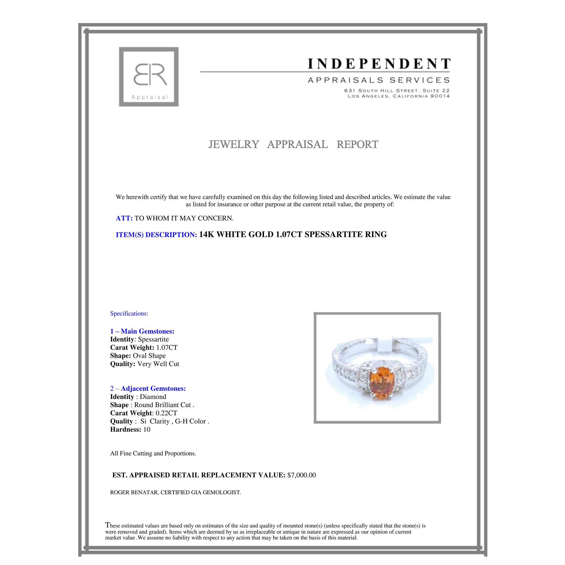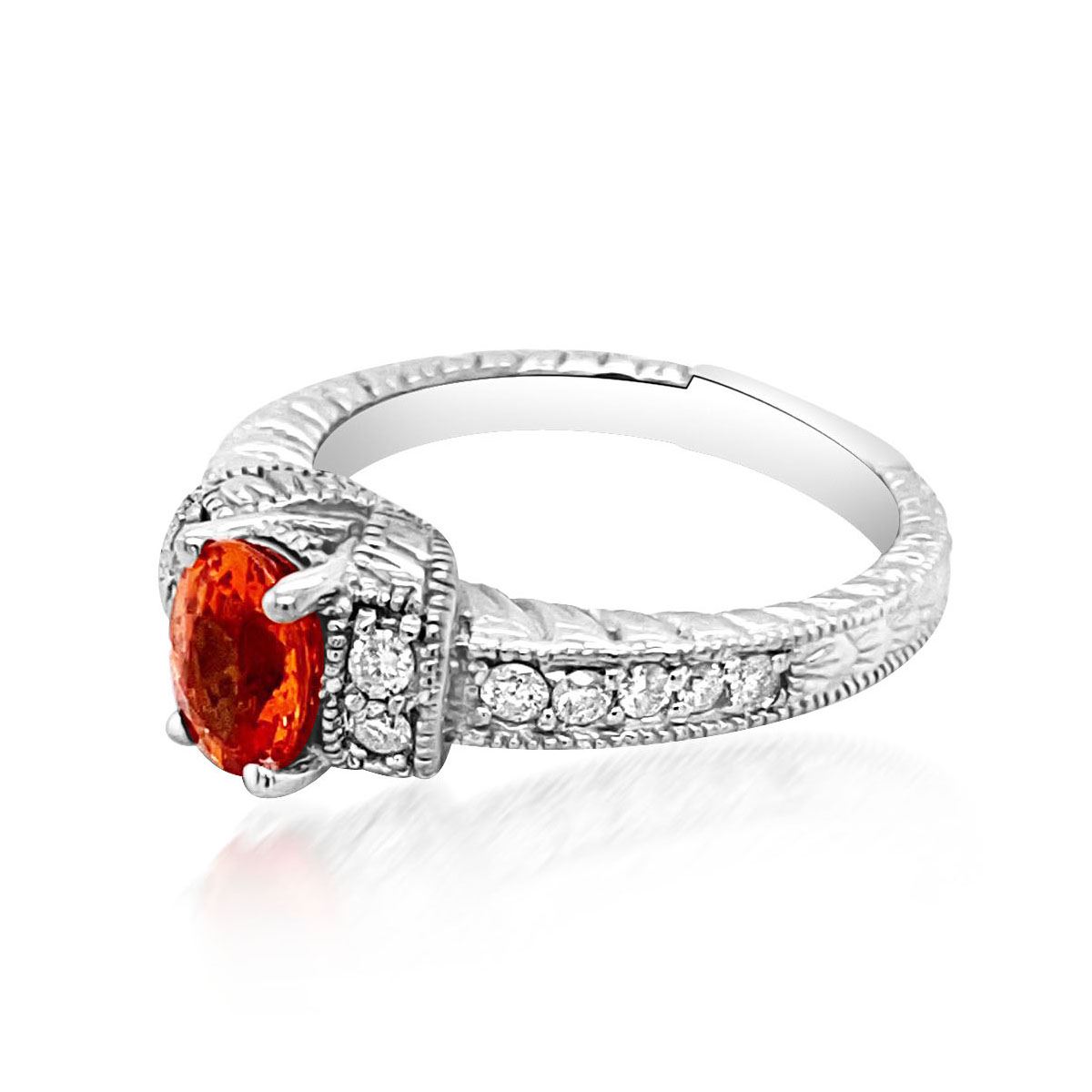 14K WHITE GOLD NATURAL SPESSARTITE RING:5.634 GRAMS/DIAMOND:0.22CT/SPESSARTITE:1.07CT/#GVR1064 **Spessartine Garnets are known to stimulate all aspects of one's creative abilities and energies. Artfully gilded in 14K white gold, this bright 1.07ct Oval Shape Spessartine radiates as boldly as a majestic sunrise. Encircled with a halo of twinkling 0.22ct round Brilliant Cut Diamonds adding a touch of subtle sparkle, further detailing adorning the ring's stepped shank.**