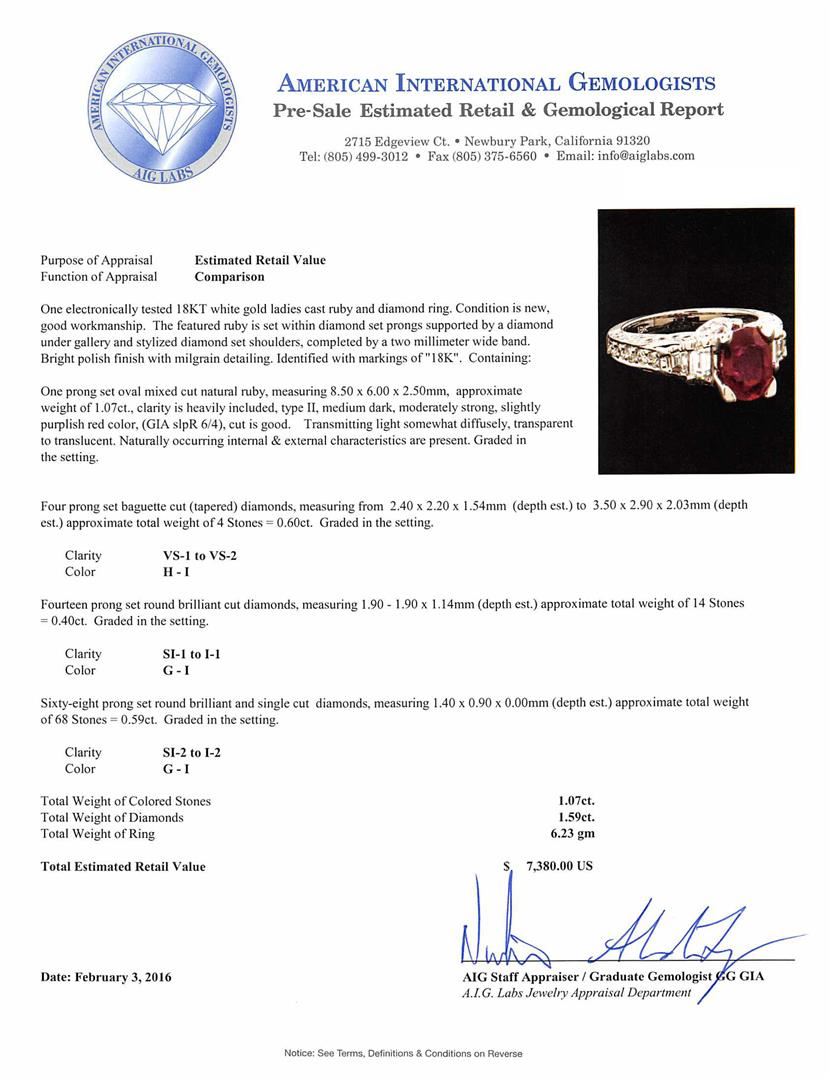 One electronically tested 18KT white gold ladies cast ruby and diamond ring. The featured ruby is set within diamond set prongs supported by a diamond under gallery and stylized diamond set shoulders, completed by a two millimeter wide band. Bright polish finish with milgrain detailing. Identified with markings of "18K". Condition is new, good workmanship. Containing: One prong set oval mixed cut natural ruby, measuring 8.50 x 6.00 x 2.50mm, approximate weight of 1.07ct., clarity is heavily included, type II, medium dark, moderately strong, slightly purplish red color, (GIA slpR 6/4), cut is good. Transmitting light somewhat diffusely, transparent to translucent. Naturally occurring internal & external characteristics are present. Graded in the setting. Four prong set baguette cut (tapered) diamonds, measuring from 2.40 x 2.20 x 1.54mm (depth est.) to 3.50 x 2.90 x 2.03mm (depth est.) approximate total weight of 4 Stones = 0.60ct. Graded in the setting. Clarity: VS-1 to VS-2. Color: H - I Fourteen prong set round brilliant cut diamonds, measuring 1.90 - 1.90 x 1.14mm (depth est.) approximate total weight of 14 Stones = 0.40ct. Graded in the setting. Clarity: SI-1 to I-1. Color: G - I Sixty-Eight prong set round brilliant and single cut diamonds, measuring 1.40 x 0.90 x 0.00mm (depth est.) approximate total weight of 68 Stones = 0.59ct. Graded in the setting. Clarity: SI-2 to I-2. Color: G - I. Total Weight of Colored Stones 1.07ct. Total Weight of Diamonds 1.59ct. Total Weight of Ring 6.23gm. AIG Appraised at $7,380.00.
