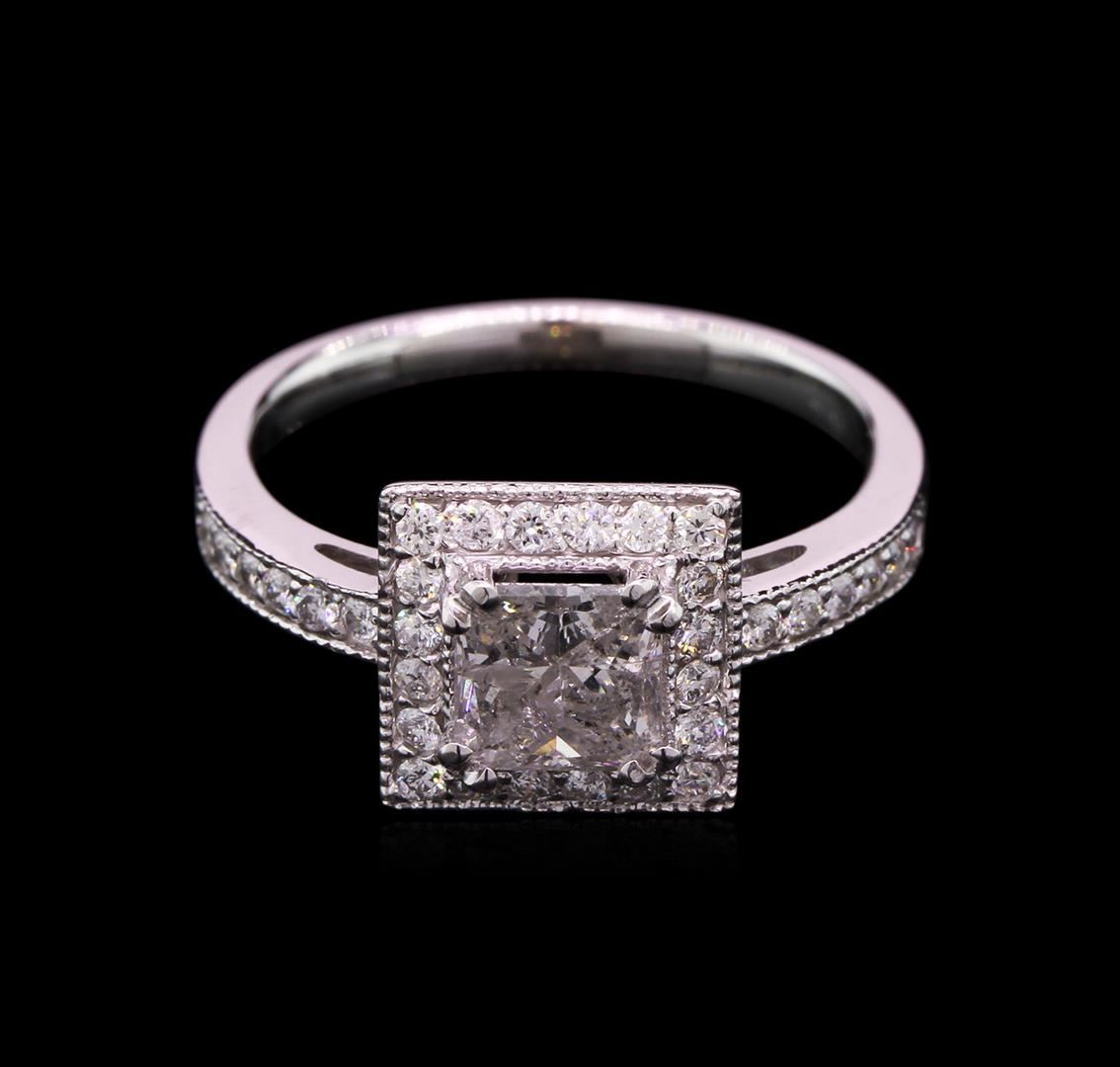One electronically tested 14KT white gold lady's cast wedding ring with a halo with a bright polish with milgrain detailing finish. The featured lady's ring has a shank measuring 1.90 millimeters in width,. Identified with markings of "K14". Condition is new, good workmanship. Containing: One prong set princess cut diamond, measuring 5.30 x 5.22 x 3.16mm (depth est.) approximate weight of 0.75ct. Graded in the setting. Clarity: I-1. Color: Good Thirty-Two prong set round brilliant cut diamonds, measuring 1.40 - 1.35 x 0.86mm (depth est.) approximate total weight of 32 Stones = 0.32ct. Graded in the setting. Clarity: SI-1 to I-1. Color: H - I. Cut Good. Total Weight of Diamonds 1.07ct. Total Weight of Ring 3.30gm. GAS Appraised at $4,780.00.