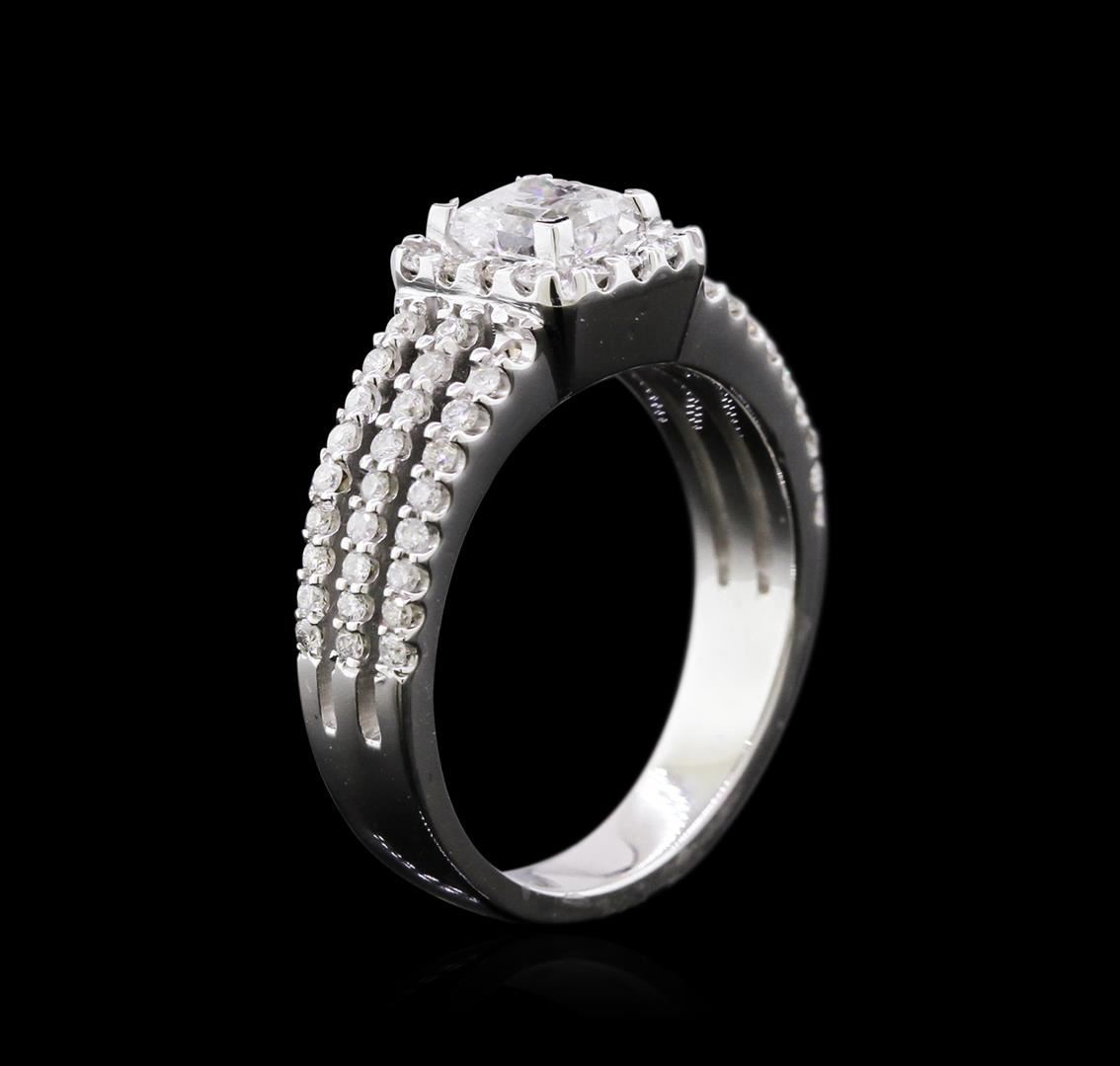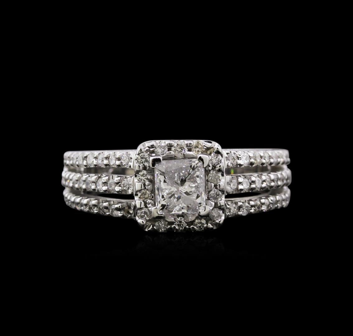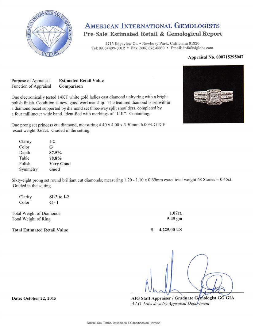 One electronically tested 14KT white gold ladies cast diamond unity ring with a bright polish finish. The featured diamond is set within a diamond bezel supported by diamond set three-way split shoulders, completed by a four millimeter wide band. Identified with markings of "14K". Condition is new, good workmanship. Containing: One prong set princess cut diamond, measuring 4.40 x 4.00 x 3.50mm, 6.00% GTCF exact weight 0.62ct. Graded in the setting. Clarity: I-2. Color: G. Depth 87.5%. Table 78.8%. Sixty-Eight prong set round brilliant cut diamonds, measuring 1.20 - 1.10 x 0.69mm exact total weight 68 Stones = 0.45ct. Graded in the setting. Clarity: SI-2 to I-2. Color: G - I. Total Weight of Diamonds 1.07ct. Total Weight of Ring 5.45gm. AIG Appraised at $4,225.00.