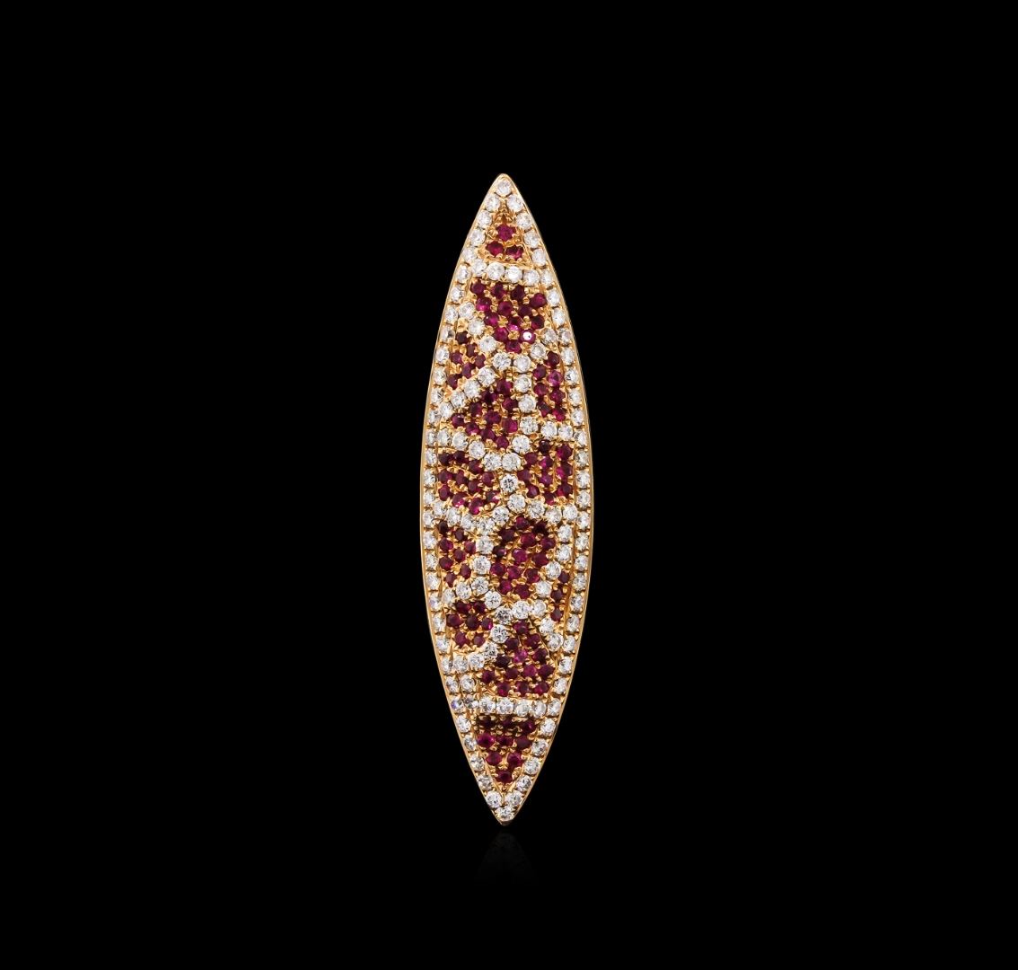 One electronically tested 18KT yellow gold ladies cast ruby and diamond pendant with a bright polish finish. Identified with markings of "18K". Condition is new. Containing: One hundred seven prong set round modified brilliant cut natural rubies, measuring 1.00 - 1.00 x 0.65 mm, approximate total weight of 1.07ct., clarity is eye clean, medium, moderately strong, red color, (GIA R 5/4), cut is good. One Hundred Twenty-Six prong set round brilliant cut diamonds, measuring 1.20 - 1.20 x 0.72mm (depth est.) approximate total weight of 126 Stones = 0.79ct. Clarity: SI-1 to SI-2. Color: I - J, Cut is Good. Colored gemstones are presumed to have been subjected to commonly used enhancement processes. All diamonds and colored gemstones are graded in the mounting, unless otherwise stated. Total Weight of Colored Stones 1.07ct. Total Weight of Diamonds 0.79ct. Total Weight of Pendant 5.80 grams. GGL Appraised at $3,495.00.