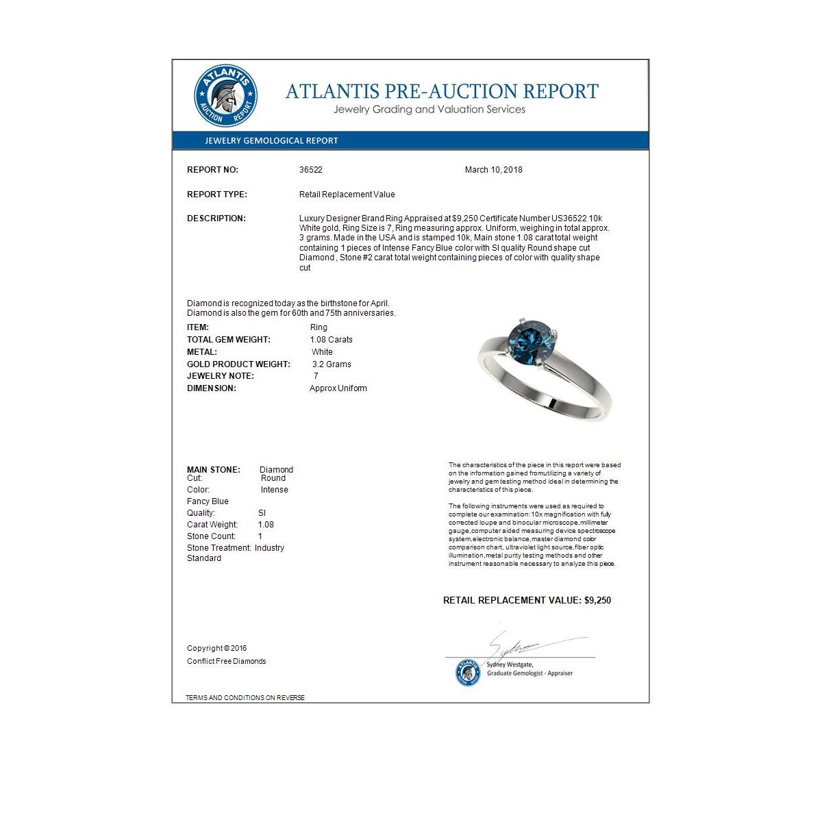 REF-115H8A -36522 ---- 1.08 CTW Certified Intense Blue SI Diamond Solitaire Engagement Ring 10K White Gold ---- Luxury Designer Brand Ring Appraised at $9,250 Certificate Number US36522 10k White gold, Ring Size is 7, Ring measuring approx. Uniform, weighing in total approx. 3 grams. Made in the USA and is stamped 10k, Main stone 1.08 carat total weight containing 1 pieces of Intense Fancy Blue color with SI quality Round shape cut Diamond , Stone #2 carat total weight containing pieces of color with quality shape cut