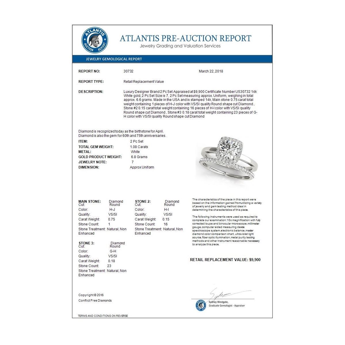 REF-200M2H -30732 ---- 1.08 CTW Certified VS/SI Diamond 2Pc Wedding Set Solitaire Halo 14K White Gold ---- Luxury Designer Brand 2 Pc Set Appraised at $9,900 Certificate Number US30732 14k White gold, 2 Pc Set Size is 7, 2 Pc Set measuring approx. Uniform, weighing in total approx. 6.6 grams. Made in the USA and is stamped 14k, Main stone 0.75 carat total weight containing 1 pieces of H-J color with VS/SI quality Round shape cut Diamond , Stone #2 0.15 carat total weight containing 16 pieces of H-I color with VS/SI quality Round shape cut Diamond , Stone #3 0.18 carat total weight containing 23 pieces of G-H color with VS/SI quality Round shape cut Diamond