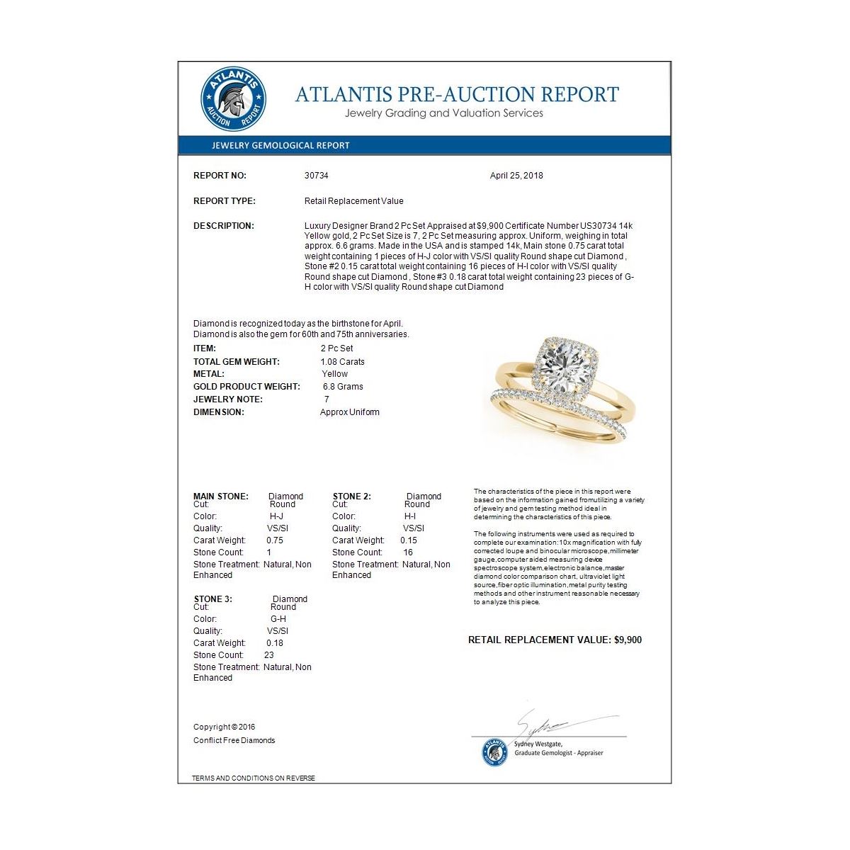 REF-200X2T -30734 ---- 1.08 CTW Certified VS/SI Diamond 2Pc Wedding Set Solitaire Halo 14K Yellow Gold ---- Luxury Designer Brand 2 Pc Set Appraised at $9,900 Certificate Number US30734 14k Yellow gold, 2 Pc Set Size is 7, 2 Pc Set measuring approx. Uniform, weighing in total approx. 6.6 grams. Made in the USA and is stamped 14k, Main stone 0.75 carat total weight containing 1 pieces of H-J color with VS/SI quality Round shape cut Diamond , Stone #2 0.15 carat total weight containing 16 pieces of H-I color with VS/SI quality Round shape cut Diamond , Stone #3 0.18 carat total weight containing 23 pieces of G-H color with VS/SI quality Round shape cut Diamond