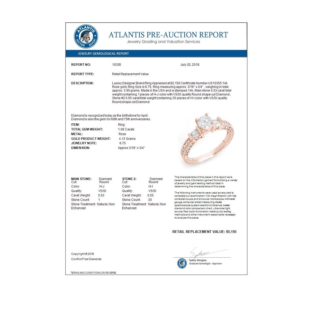 REF-117W3F -10355 ---- 1.08 CTW Certified VS/SI Diamond Ring 14K Rose Gold ---- Luxury Designer Brand Ring Appraised at $5,150 Certificate Number US10355 14k Rose gold, Ring Size is 6.75, Ring measuring approx. 3/16" x 3/4" , weighing in total approx. 3.95 grams. Made in the USA and is stamped 14k, Main stone 0.53 carat total weight containing 1 pieces of H-J color with VS/SI quality Round shape cut Diamond , Stone #2 0.55 carat total weight containing 30 pieces of H-I color with VS/SI quality Round shape cut Diamond