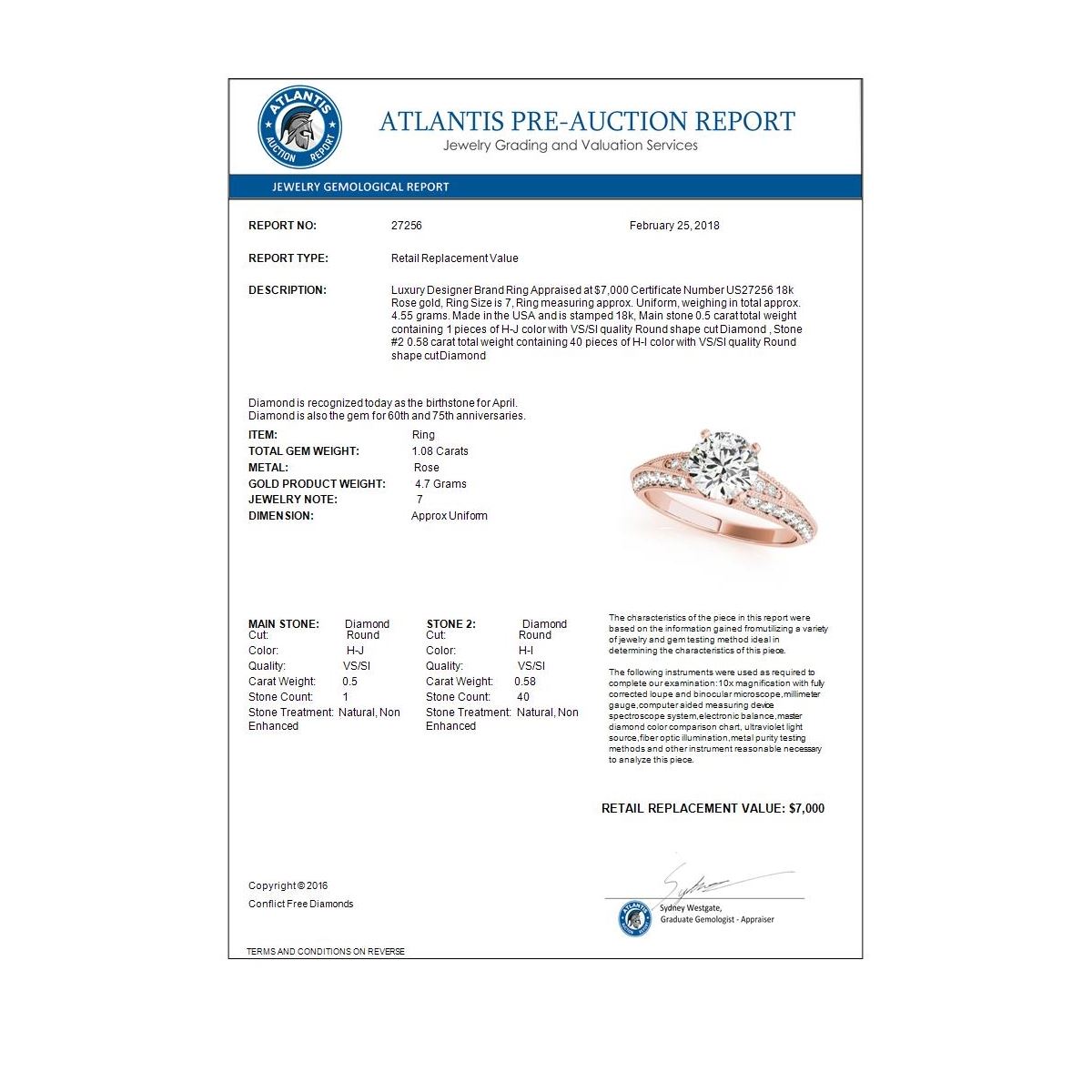 REF-127Y3K -27256 ---- 1.08 CTW Certified VS/SI Diamond Solitaire Antique Ring 18K Rose Gold ---- Luxury Designer Brand Ring Appraised at $7,000 Certificate Number US27256 18k Rose gold, Ring Size is 7, Ring measuring approx. Uniform, weighing in total approx. 4.55 grams. Made in the USA and is stamped 18k, Main stone 0.5 carat total weight containing 1 pieces of H-J color with VS/SI quality Round shape cut Diamond , Stone #2 0.58 carat total weight containing 40 pieces of H-I color with VS/SI quality Round shape cut Diamond