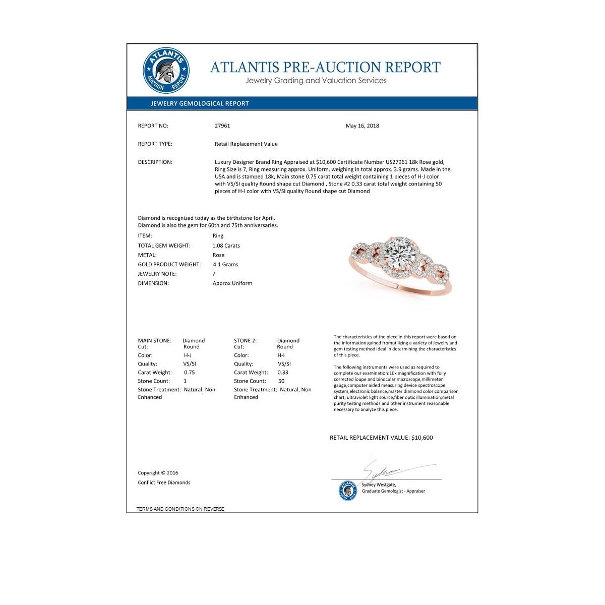 REF-192M9H -27961 ---- 1.08 CTW Certified VS/SI Diamond Solitaire Ring 18K Rose Gold ---- Luxury Designer Brand Ring Appraised at $10,600 Certificate Number US27961 18k Rose gold, Ring Size is 7, Ring measuring approx. Uniform, weighing in total approx. 3.9 grams. Made in the USA and is stamped 18k, Main stone 0.75 carat total weight containing 1 pieces of H-J color with VS/SI quality Round shape cut Diamond , Stone #2 0.33 carat total weight containing 50 pieces of H-I color with VS/SI quality Round shape cut Diamond