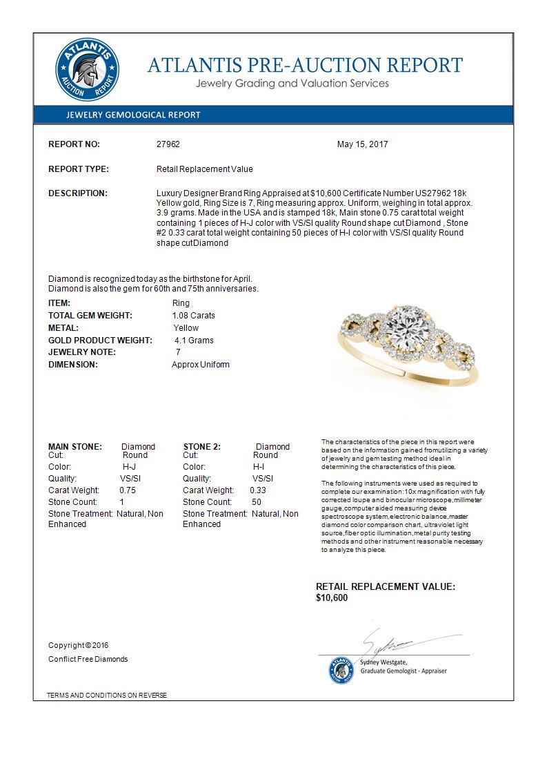 1.08 CTW Certified VS/SI Diamond Solitaire Ring 18K Yellow Gold ---- Luxury Designer Brand Ring Appraised Retail Price at $10,600 ---- SKU Number US27962 18k Yellow gold Ring Size is 7, Ring measuring approx. Uniform, weighing in total approx. 3.9 grams. Made in the USA and is stamped 18k, Main stone 0.75 carat total weight containing 1 pieces of H-J color with VS/SI quality Round shape cut Diamond , Stone #2 0.33 carat total weight containing 50 pieces of H-I color with VS/SI quality Round shape cut