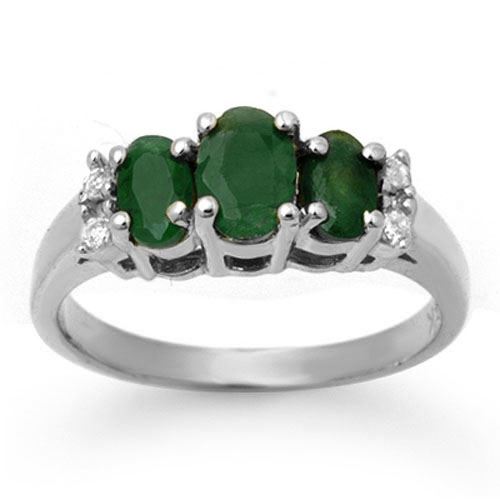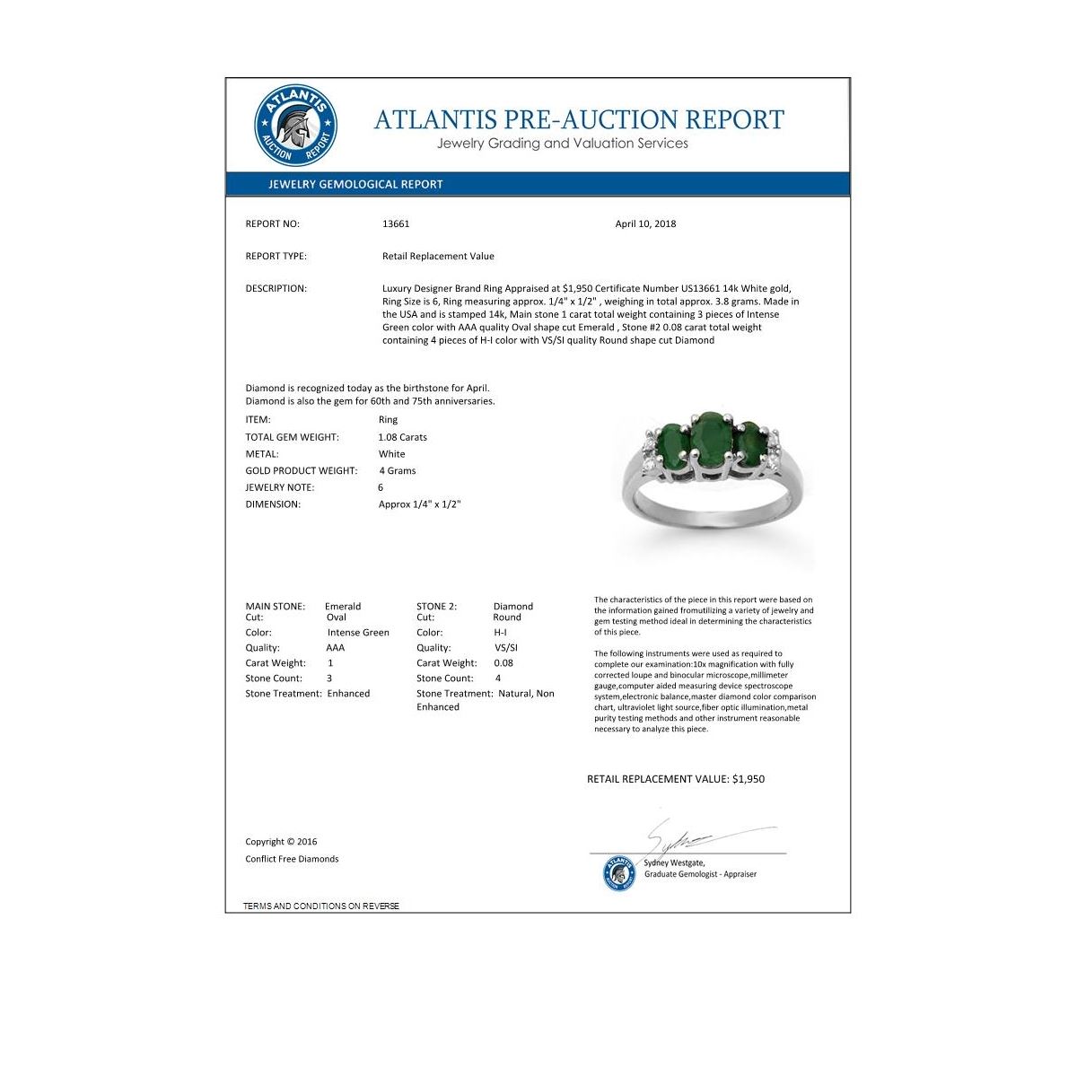REF-29X3T -13661 ---- 1.08 CTW Emerald & Diamond Ring 14K White Gold ---- Luxury Designer Brand Ring Appraised at $1,950 Certificate Number US13661 14k White gold, Ring Size is 6, Ring measuring approx. 1/4" x 1/2" , weighing in total approx. 3.8 grams. Made in the USA and is stamped 14k, Main stone 1 carat total weight containing 3 pieces of Intense Green color with AAA quality Oval shape cut Emerald , Stone #2 0.08 carat total weight containing 4 pieces of H-I color with VS/SI quality Round shape cut Diamond