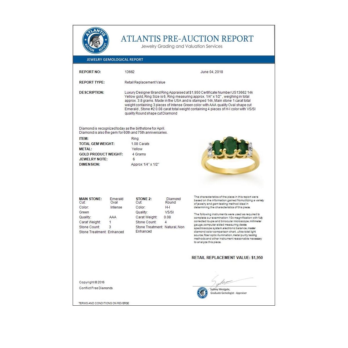 REF-29M3H -13662 ---- 1.08 CTW Emerald & Diamond Ring 14K Yellow Gold ---- Luxury Designer Brand Ring Appraised at $1,950 Certificate Number US13662 14k Yellow gold, Ring Size is 6, Ring measuring approx. 1/4" x 1/2" , weighing in total approx. 3.8 grams. Made in the USA and is stamped 14k, Main stone 1 carat total weight containing 3 pieces of Intense Green color with AAA quality Oval shape cut Emerald , Stone #2 0.08 carat total weight containing 4 pieces of H-I color with VS/SI quality Round shape cut Diamond