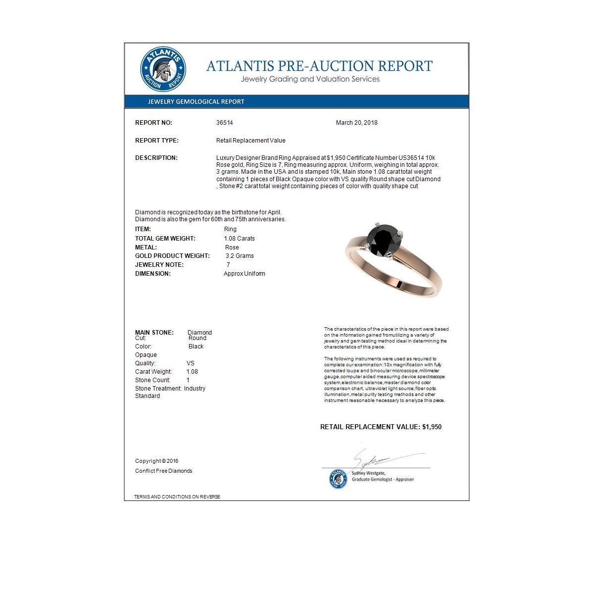 REF-29T3M -36514 ---- 1.08 CTW Fancy Black VS Diamond Solitaire Engagement Ring 10K Rose Gold ---- Luxury Designer Brand Ring Appraised at $1,950 Certificate Number US36514 10k Rose gold, Ring Size is 7, Ring measuring approx. Uniform, weighing in total approx. 3 grams. Made in the USA and is stamped 10k, Main stone 1.08 carat total weight containing 1 pieces of Black Opaque color with VS quality Round shape cut Diamond , Stone #2 carat total weight containing pieces of color with quality shape cut
