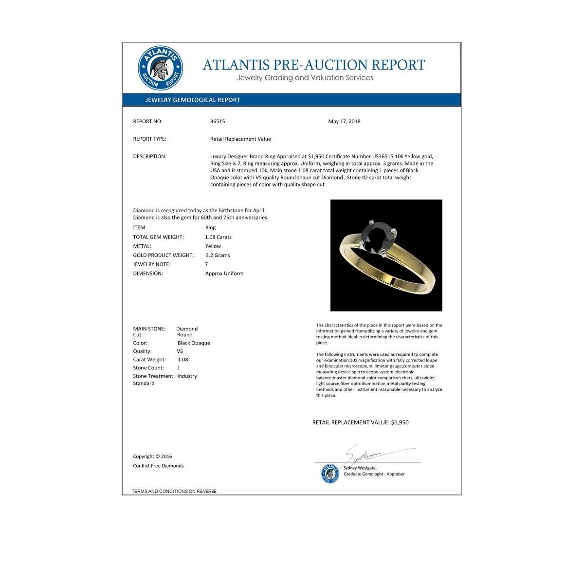 REF-29K3W -36515 ---- 1.08 CTW Fancy Black VS Diamond Solitaire Engagement Ring 10K Yellow Gold ---- Luxury Designer Brand Ring Appraised at $1,950 Certificate Number US36515 10k Yellow gold, Ring Size is 7, Ring measuring approx. Uniform, weighing in total approx. 3 grams. Made in the USA and is stamped 10k, Main stone 1.08 carat total weight containing 1 pieces of Black Opaque color with VS quality Round shape cut Diamond , Stone #2 carat total weight containing pieces of color with quality shape cut
