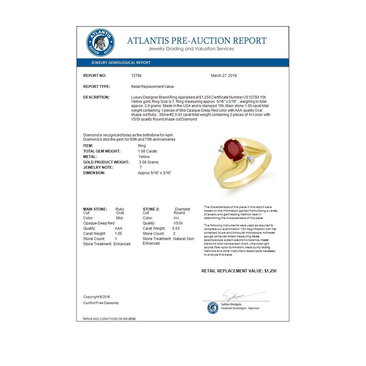REF-18F9N -12784 ---- 1.08 CTW Ruby & Diamond Ring 10K Yellow Gold ---- Luxury Designer Brand Ring Appraised at $1,250 Certificate Number US12784 10k Yellow gold, Ring Size is 7, Ring measuring approx. 5/16" x 3/16" , weighing in total approx. 2.9 grams. Made in the USA and is stamped 10k, Main stone 1.05 carat total weight containing 1 pieces of Mid-Opaque-Deep Red color with AAA quality Oval shape cut Ruby , Stone #2 0.03 carat total weight containing 2 pieces of H-I color with VS/SI quality Round shape cut Diamond