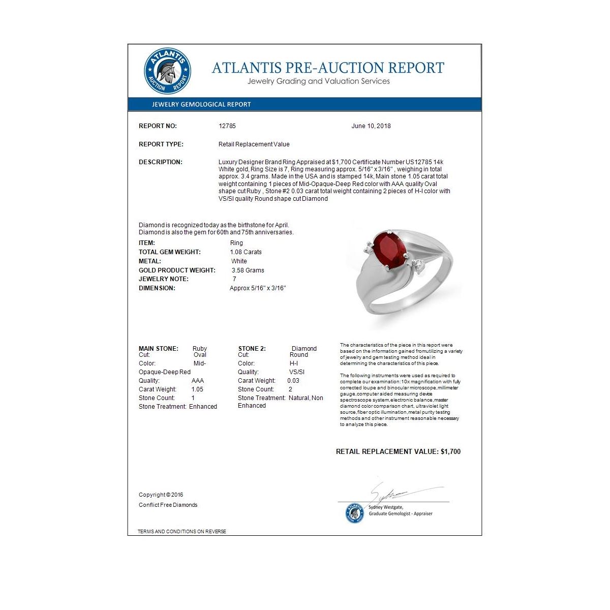 REF-25K5W -12785 ---- 1.08 CTW Ruby & Diamond Ring 14K White Gold ---- Luxury Designer Brand Ring Appraised at $1,700 Certificate Number US12785 14k White gold, Ring Size is 7, Ring measuring approx. 5/16" x 3/16" , weighing in total approx. 3.4 grams. Made in the USA and is stamped 14k, Main stone 1.05 carat total weight containing 1 pieces of Mid-Opaque-Deep Red color with AAA quality Oval shape cut Ruby , Stone #2 0.03 carat total weight containing 2 pieces of H-I color with VS/SI quality Round shape cut Diamond