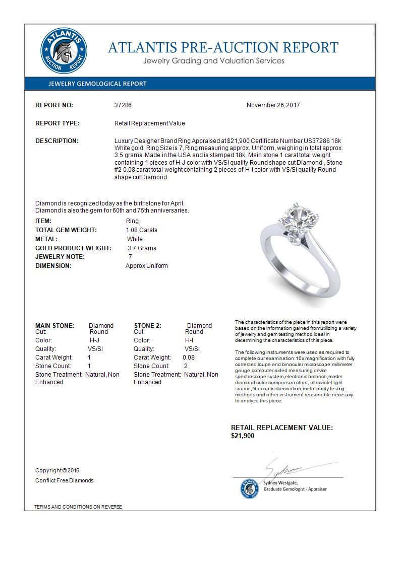 37286 - REF-361Y8X ---- 1.08 CTW VS/SI Diamond Solitaire Art Deco Ring 18K White Gold ---- Luxury Designer Brand Ring Appraised at $21,900 Certificate Number US37286 18k White gold, Ring Size is 7, Ring measuring approx. Uniform, weighing in total approx. 3.5 grams. Made in the USA and is stamped 18k, Main stone 1 carat total weight containing 1 pieces of H-J color with VS/SI quality Round shape cut Diamond , Stone #2 0.08 carat total weight containing 2 pieces of H-I color with VS/SI quality Round shape cut Diamond