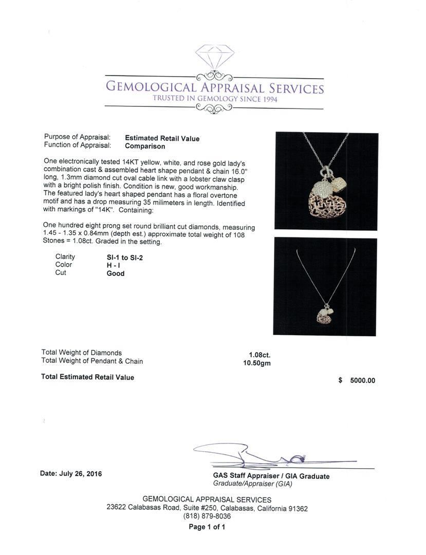 One electronically tested 14KT yellow, white, and rose gold lady's combination cast & assembled heart shape pendant & chain 16.0' long, 1.3mm diamond cut oval cable link with a lobster claw clasp with a bright polish finish. The featured lady's heart shaped pendant has a floral overtone motif and has a drop measuring 35 millimeters in length. Identified with markings of '14K'. Condition is new, good workmanship. Containing: One Hundred Eight prong set round brilliant cut diamonds, measuring 1.45 - 1.35 x 0.84mm (depth est.) approximate total weight of 108 Stones = 1.08ct. Graded in the setting. Clarity SI-1 to SI-2. Color: H - I Cut Good. Total Weight of Diamonds 1.08ct.. Total Weight of Pendant & Chain 10.50gm. GAS Appraised.