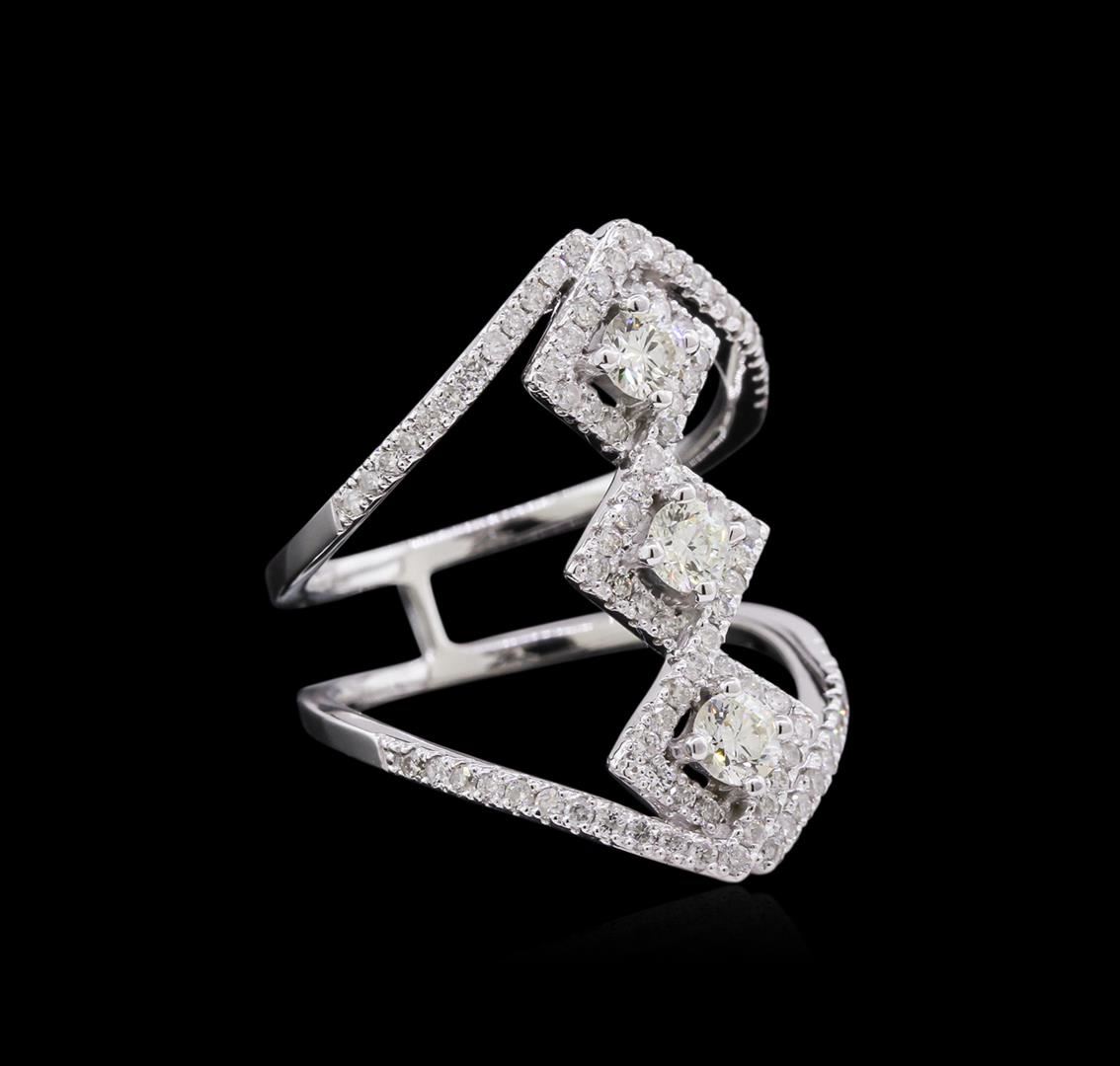 One electronically tested 14KT white gold ladies cast diamond ring with a bright polish finish. The ring features a series of thee round brilliant diamonds set within diamond bezels and placed within mirroring diamond ribbons, completed by a five and one-half millimeter wide band. Identified with markings of "585". Condition is new, good workmanship. Containing: Three prong set round brilliant cut diamonds, measuring 3.50 - 3.40 x 2.07mm exact total weight 3 Stones = 0.48ct. Graded in the setting. Clarity: SI-2 to I-1. Color: J - K Ninety-Four prong set round brilliant cut diamonds, measuring 1.20 - 1.10 x 0.69mm exact total weight 94 Stones = 0.60ct. Graded in the setting. Clarity: SI-2 to I-2. Color: G - I. Total Weight of Diamonds 1.08ct. Total Weight of Ring 4.77gm. AIG Appraised at $3,865.00.