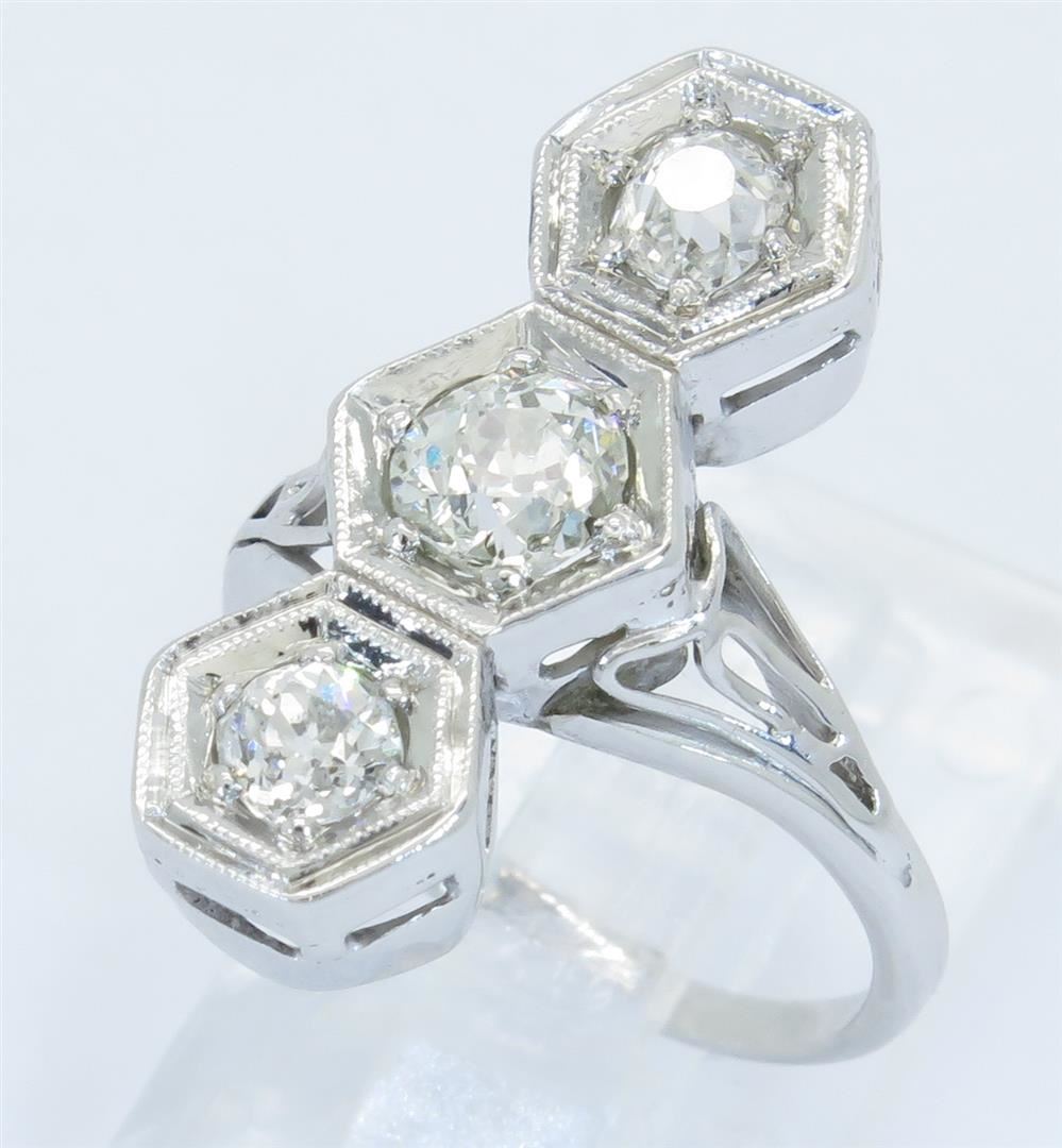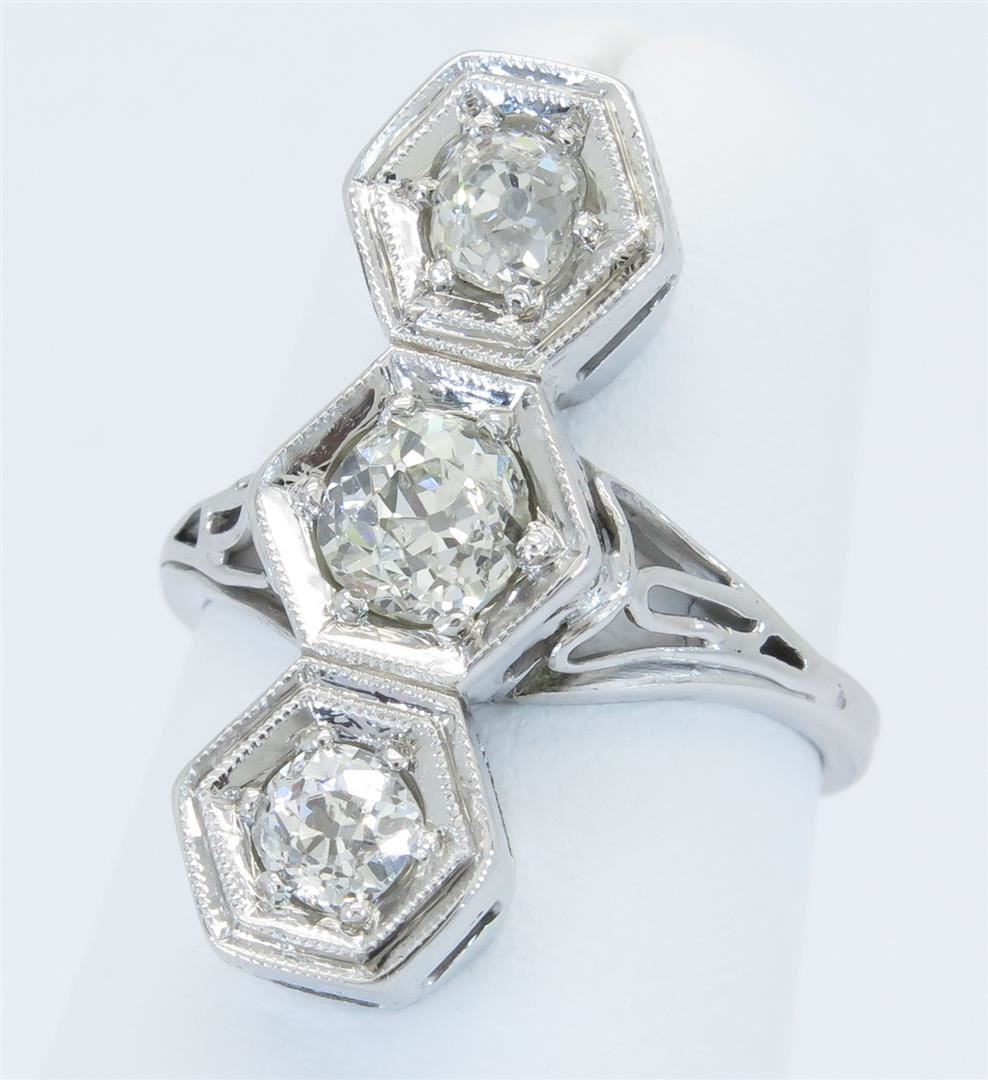 One tested 14K white gold diamond ring. Containing: three Old European Cut Diamonds. Clarity: I-SI, Color: E-G. Approximate total diamond weight: 1.08CTW. Diamonds are graded in the mounting, unless otherwise stated. Weight: 3.9 grams. Size: 3.75
