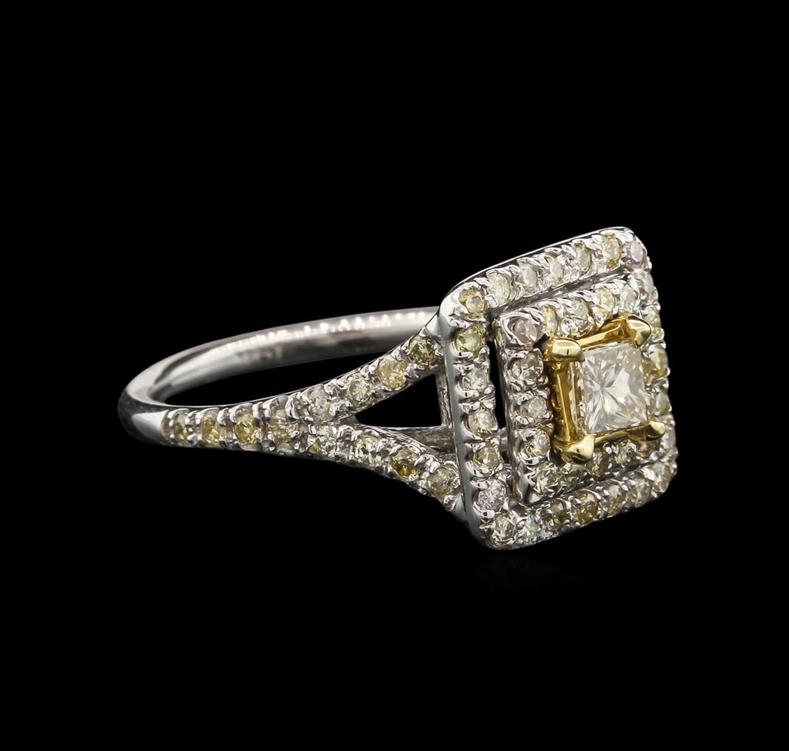 One electronically tested 14KT white gold ladies cast diamond unity ring. The featured diamond is set within two tiered diamond bezels supported by a lattice under gallery and diamond set split shoulders, completed by a one and one-half millimeter wide band. Bright polish finish with yellow gold accents. Identified with markings of "14K". Condition is new, good workmanship. Containing: One prong set princess cut diamond, measuring 3.90 x 3.80 x 2.60mm (depth est.) approximate weight of 0.41ct with a medium blue fluorescence. Graded in the setting. Clarity: VS-1. Depth: 68.4%. Table 92.1%. Sixty-Four prong set round brilliant cut diamonds, measuring 1.50 - 1.20 x 0.81mm approximate. Total Weight of 64 Stones = 0.67ct. The group is composed of a mix of natural faint yellow, very light yellow, light yellow, faint brown, very light brown and light brown color diamonds. Clarity: SI-2 to I-2. Total Weight of Diamonds 1.08ct. Total Weight of Ring 4.61gm. AIG Appraised at $3,055.00.