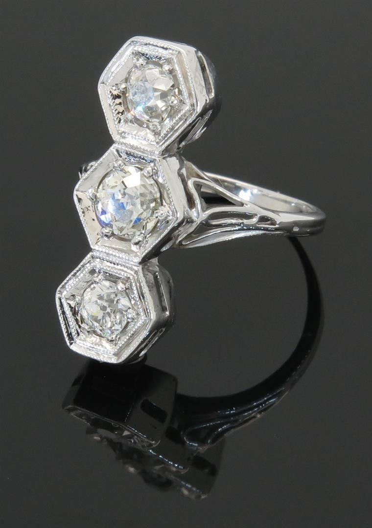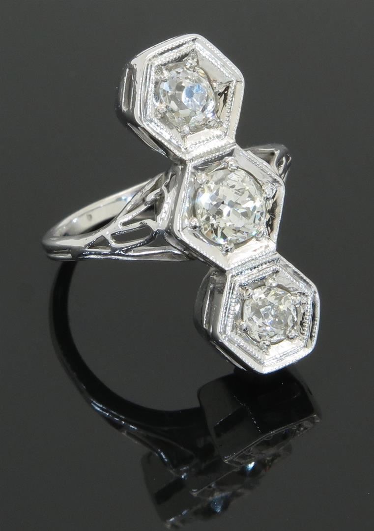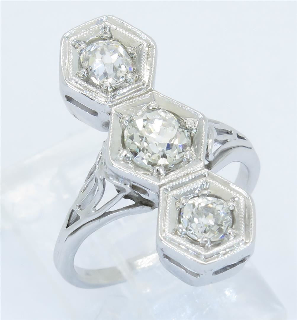 One tested 14K white gold diamond ring. Containing: three Old European Cut Diamonds. Clarity: I-SI, Color: E-G. Approximate total diamond weight: 1.08CTW. Diamonds are graded in the mounting, unless otherwise stated. Weight: 3.9 grams. Size: 3.75