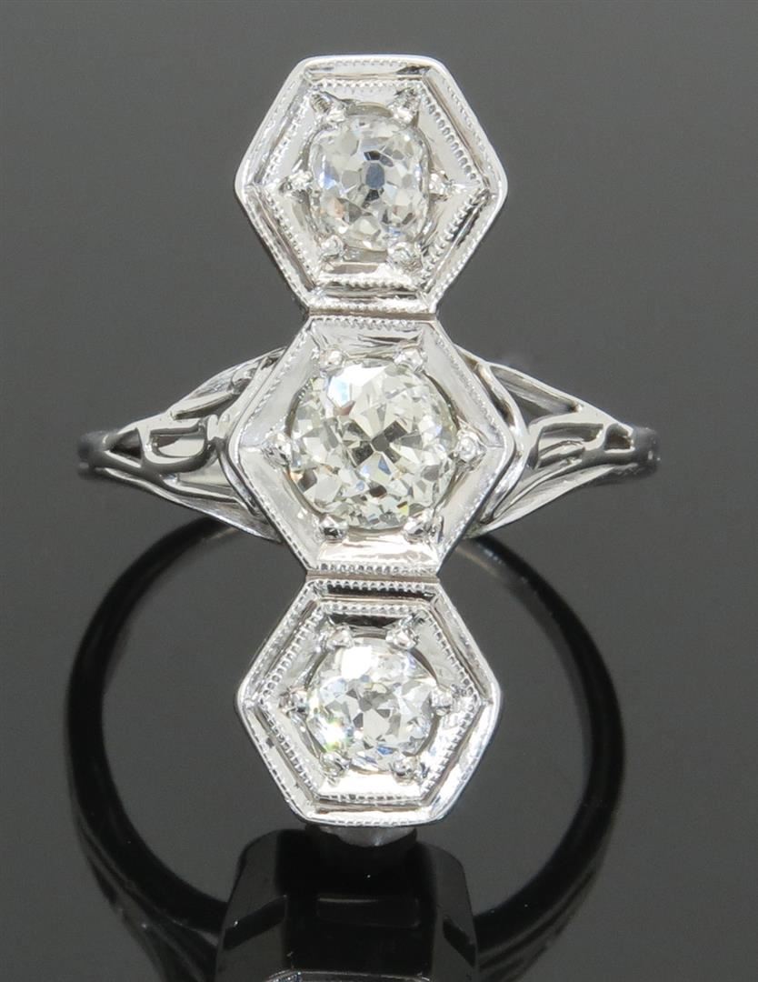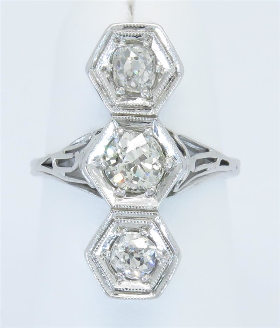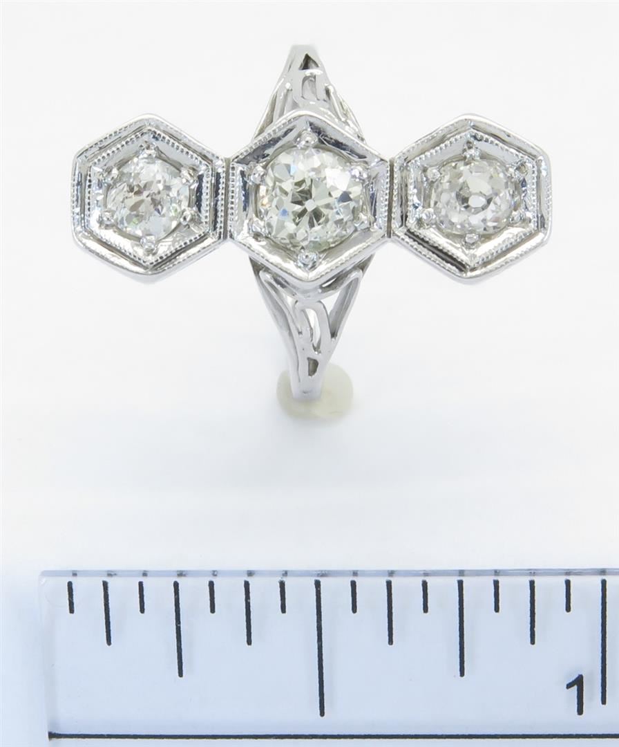 One tested 14K white gold diamond ring. Containing: three Old European Cut Diamonds. Clarity: I-SI, Color: E-G. Approximate total diamond weight: 1.08CTW. Diamonds are graded in the mounting, unless otherwise stated. Weight: 3.9 grams. Size: 3.75