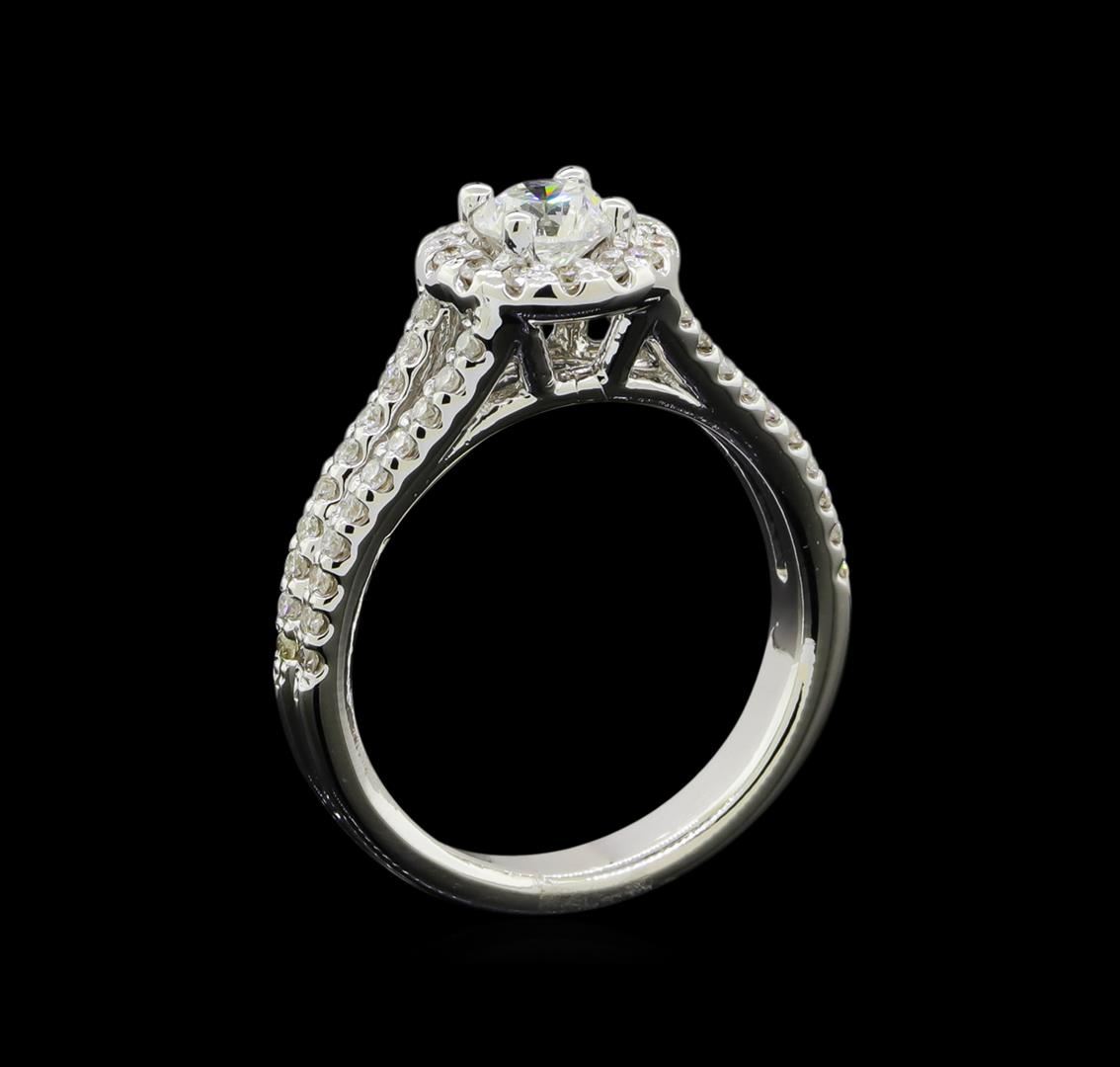 One electronically tested 14KT white gold lady's cast wedding ring with a split shank halo with a bright polish finish. The featured lady's ring has a double shank measuring 3.44 millimeters wide. Identified with markings of '14K'. Condition is new, good workmanship. Containing: One prong set round brilliant cut diamond, measuring 5.12 - 5.09 x 3.33mm (depth est.) , 10.00.%. GTCF approximate weight of 0.58ct. Graded in the setting. Clarity I-1. Color: H Cut Good Fifty-Four prong set round brilliant cut diamonds, measuring 1.45 - 1.30 x 0.83mm (depth est.) approximate total weight of 54 Stones = 0.50ct. Graded in the setting. Clarity SI-1 to SI-2. Color: H - I Cut Good. Total Weight of Diamonds 1.08ct.. Total Weight of Ring 5.40gm. GAS Appraised at $5,535.00.