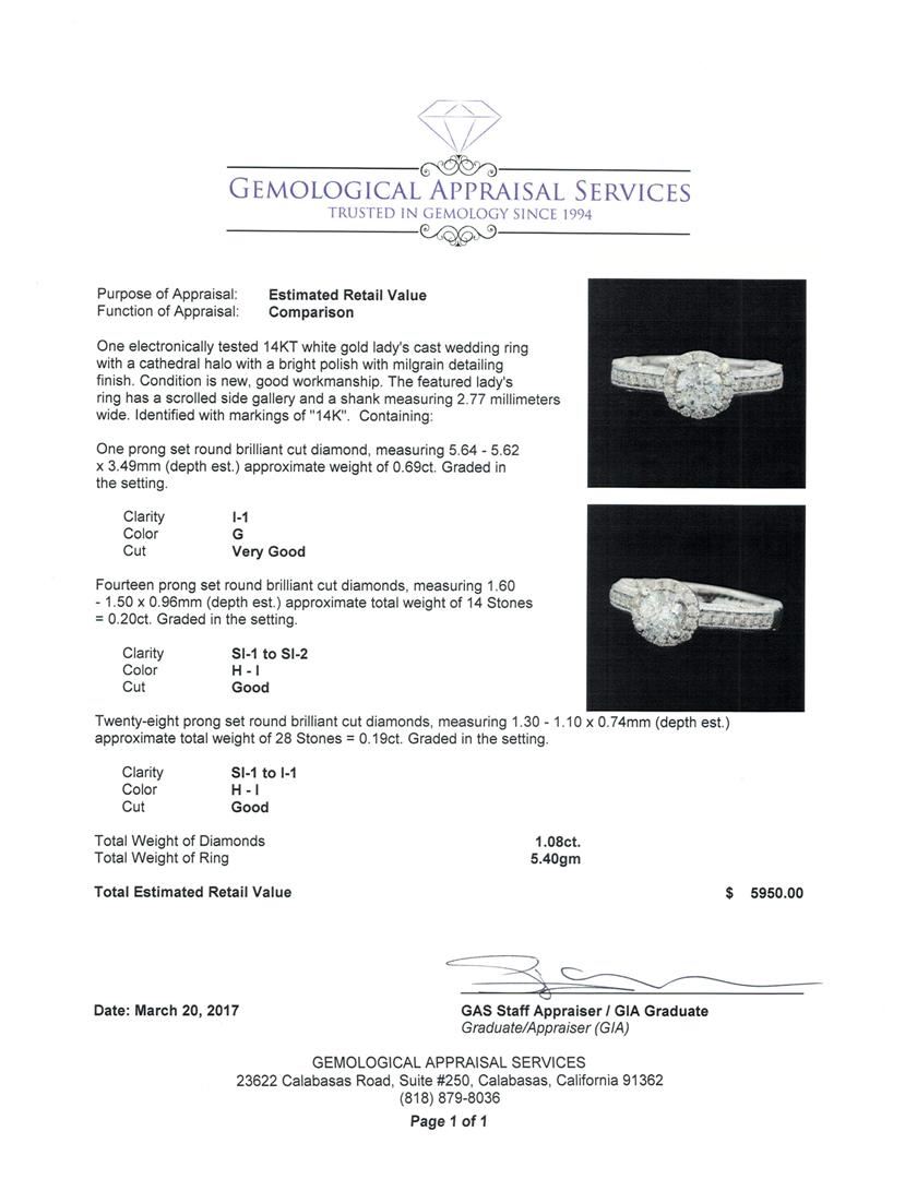 One electronically tested 14KT white gold lady's cast wedding ring with a cathedral halo with a bright polish with milgrain detailing finish. The featured lady's ring has a scrolled side gallery and a shank measuring 2.77 millimeters wide. Identified with markings of '14K'. Condition is new, good workmanship. Containing: One prong set round brilliant cut diamond, measuring 5.64 - 5.62 x 3.49mm (depth est.) approximate weight of 0.69ct. Graded in the setting. Color G Clarity I-1 Cut Very Good Fourteen prong set round brilliant cut diamonds, measuring 1.60 - 1.50 x 0.96mm (depth est.) approximate total weight of 14 Stones = 0.20ct. Graded in the setting. Color H - I Clarity SI-1 to SI-2 Cut Good Twenty-Eight prong set round brilliant cut diamonds, measuring 1.30 - 1.10 x 0.74mm (depth est.) approximate total weight of 28 Stones = 0.19ct. Graded in the setting. Color H - I Clarity SI-1 to I-1 Cut Good. Total Weight of Diamonds 1.08ct.. Total Weight of Ring 5.40gm GAS Appraised at $5,950.00.