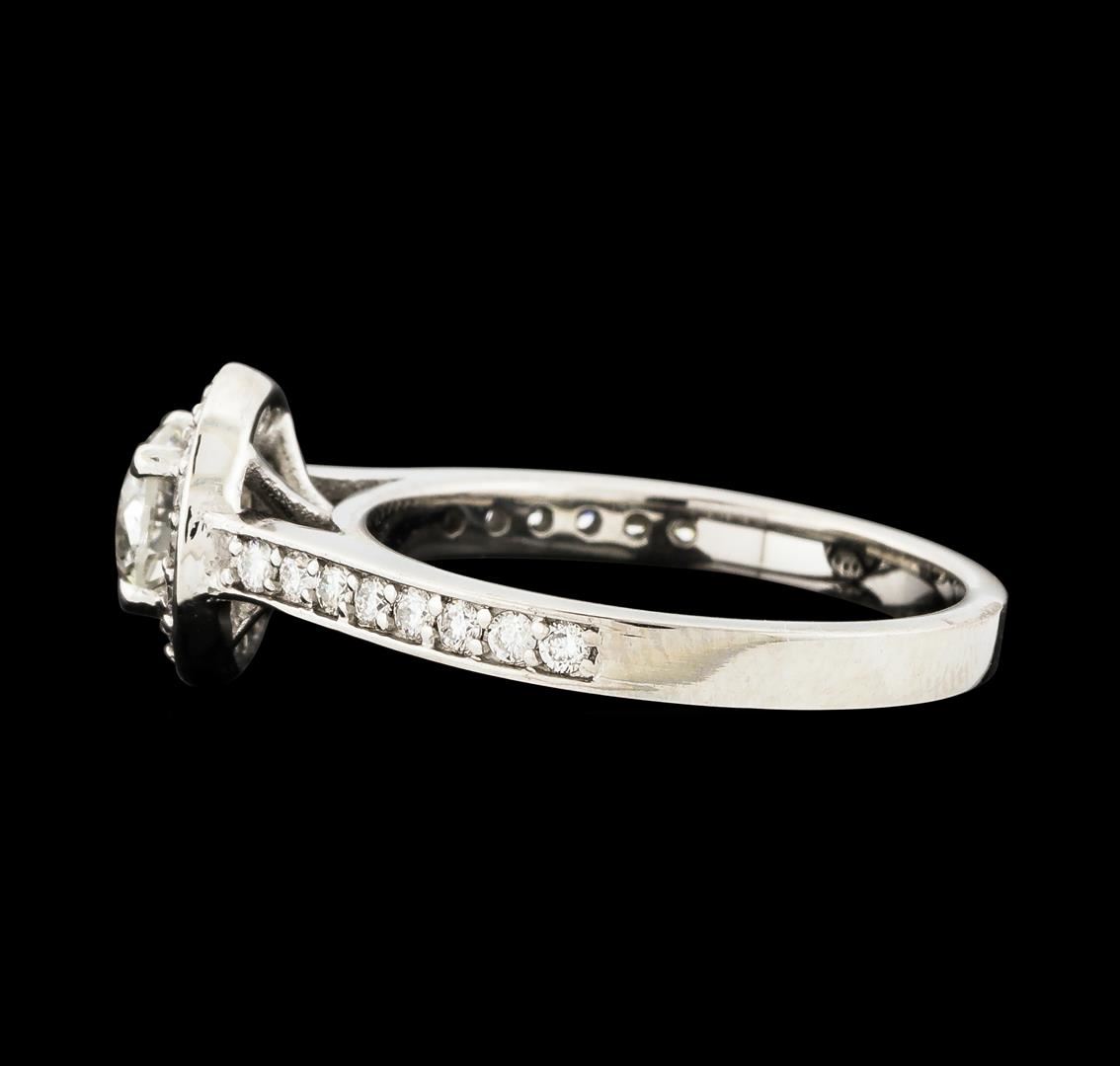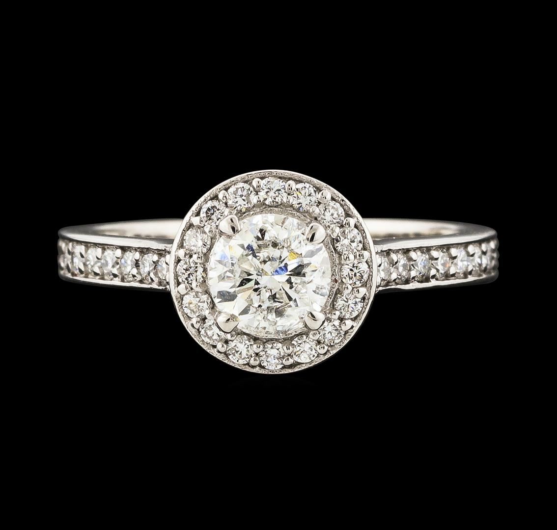 One electronically tested 14KT white gold lady's cast wedding ring with a cathedral halo with a bright polish with milgrain detailing finish. The featured lady's ring has a shank measuring 2.37 millimeters wide. Identified with markings of '14K'. Condition is new, good workmanship. Containing: One prong set round brilliant cut diamond, measuring 5.48 - 5.42 x 3.54mm (depth est.) , 5.00.%. GTCF approximate weight of 0.70ct. Graded in the setting. Clarity I-1. Color: H Cut Very Good Thirty-Two prong set round brilliant cut diamonds, measuring 1.50 - 1.40 x 0.90mm (depth est.) approximate total weight of 32 Stones = 0.38ct. Graded in the setting. Clarity VS-2 to SI-2. Color: G - H Cut Good. Total Weight of Diamonds 1.08ct.. Total Weight of Ring 3.80gm. GAS Appraised at $5,205.00.