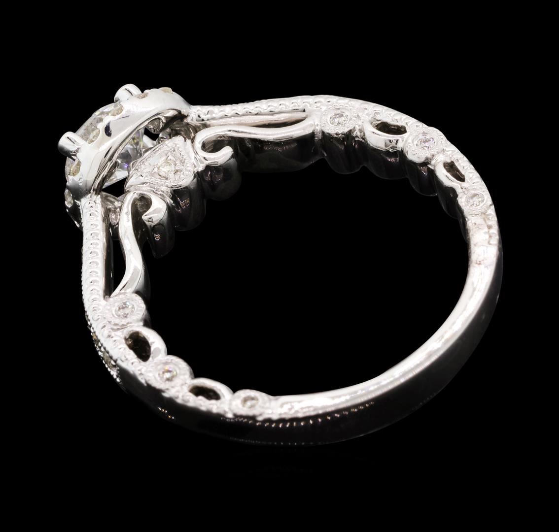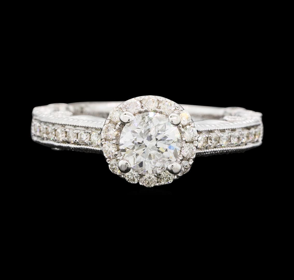 One electronically tested 14KT white gold lady's cast wedding ring with a cathedral halo with a bright polish with milgrain detailing finish. The featured lady's ring has a scrolled side gallery and a shank measuring 2.77 millimeters wide. Identified with markings of '14K'. Condition is new, good workmanship. Containing: One prong set round brilliant cut diamond, measuring 5.64 - 5.62 x 3.49mm (depth est.) approximate weight of 0.69ct. Graded in the setting. Color G Clarity I-1 Cut Very Good Fourteen prong set round brilliant cut diamonds, measuring 1.60 - 1.50 x 0.96mm (depth est.) approximate total weight of 14 Stones = 0.20ct. Graded in the setting. Color H - I Clarity SI-1 to SI-2 Cut Good Twenty-Eight prong set round brilliant cut diamonds, measuring 1.30 - 1.10 x 0.74mm (depth est.) approximate total weight of 28 Stones = 0.19ct. Graded in the setting. Color H - I Clarity SI-1 to I-1 Cut Good. Total Weight of Diamonds 1.08ct.. Total Weight of Ring 5.40gm GAS Appraised at $5,950.00.