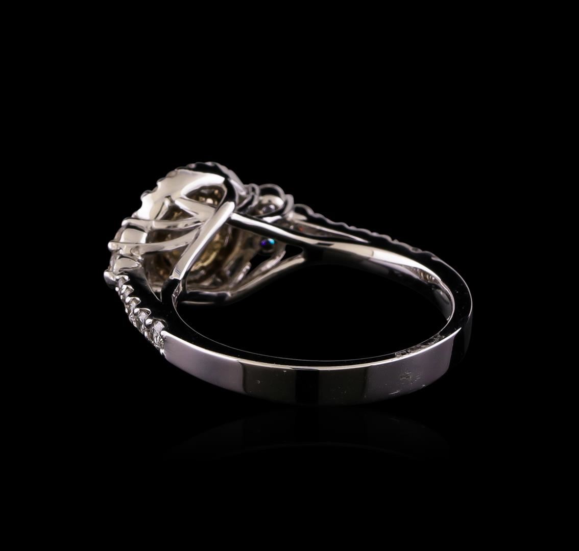 One electronically tested 14KT white gold lady's combination cast & assembled wedding ring with a halo with a bright polish finish. The featured lady's ring has a shank measuring 2.90 millimeters wide. Identified with markings of 'K14'. Condition is new, good workmanship. Containing: One prong set round brilliant cut diamond, measuring 5.20 - 5.10 x 3.25mm (depth est.) approximate weight of 0.55ct. Graded in the setting. Clarity I-1. Color: I - J Cut Very Good Six prong set round brilliant cut diamonds, measuring 2.30 - 2.20 x 1.35mm (depth est.) approximate total weight of 6 Stones = 0.25ct. Graded in the setting. Clarity SI-1 to SI-2. Color: H - I Cut Good Ten prong set round brilliant cut diamonds, measuring 1.80 - 1.40 x 0.99mm (depth est.) approximate total weight of 10 Stones = 0.16ct. Graded in the setting. Clarity SI-1 to SI-2. Color: H - I Cut Good Twenty prong set round brilliant cut diamonds, measuring 1.20 - 1.15 x 0.72mm (depth est.) approximate total weight of 20 Stones = 0.12ct. Graded in the setting. Clarity SI-2 to I-1. Color: H - I Cut Good. Total Weight of Diamonds 1.08ct.. Total Weight of Ring 4.30gm. GAS Appraised at $5,080.00.