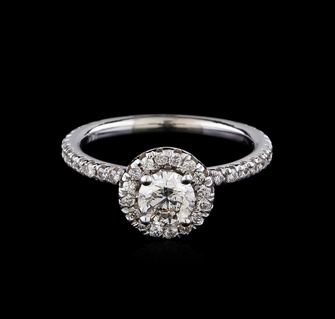 One electronically tested 14KT white gold lady's cast wedding ring with a halo with a bright polish finish. The featured lady's ring has a shank measuring 1.92 millimeters in width. Identified with markings of "14K". Condition is new, good workmanship. Containing: One prong set round brilliant cut diamond, measuring 5.49 - 5.41 x 3.49mm (depth est.) approximate weight of 0.64ct. Graded in the setting. Clarity: SI-2. Color: I. Cut Good Forty-Six prong set round brilliant cut diamonds, measuring 1.40 - 1.35 x 0.84mm (depth est.) approximate total weight of 46 Stones = 0.44ct. Graded in the setting. Clarity: VS-2 to SI-2. Color: G - Good. Total Weight of Diamonds 1.08ct. Total Weight of Ring 3.00gm. GAS Appraised at $6,265.00.