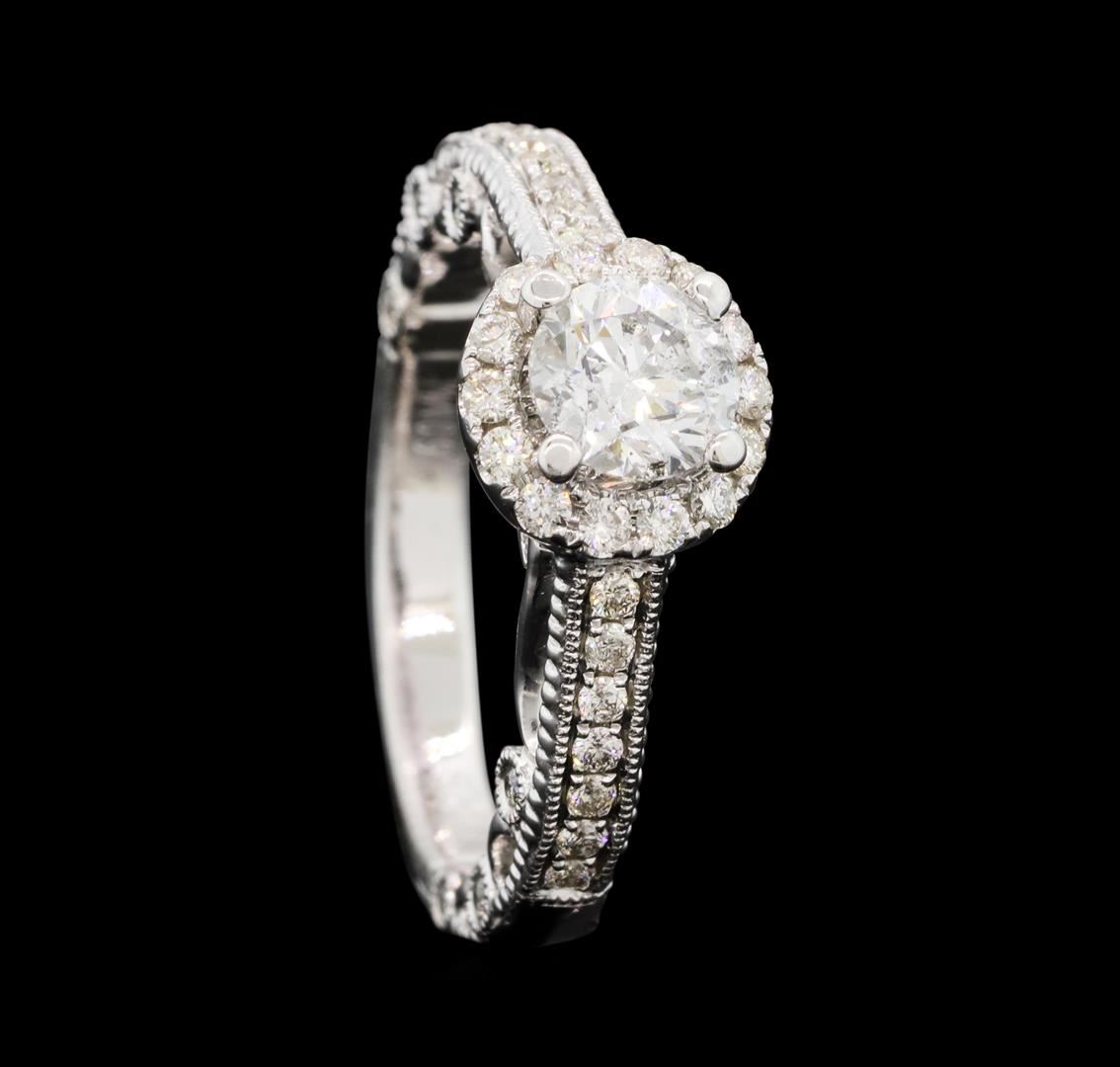 One electronically tested 14KT white gold lady's cast wedding ring with a cathedral halo with a bright polish with milgrain detailing finish. The featured lady's ring has a scrolled side gallery and a shank measuring 2.77 millimeters wide. Identified with markings of '14K'. Condition is new, good workmanship. Containing: One prong set round brilliant cut diamond, measuring 5.64 - 5.62 x 3.49mm (depth est.) approximate weight of 0.69ct. Graded in the setting. Color G Clarity I-1 Cut Very Good Fourteen prong set round brilliant cut diamonds, measuring 1.60 - 1.50 x 0.96mm (depth est.) approximate total weight of 14 Stones = 0.20ct. Graded in the setting. Color H - I Clarity SI-1 to SI-2 Cut Good Twenty-Eight prong set round brilliant cut diamonds, measuring 1.30 - 1.10 x 0.74mm (depth est.) approximate total weight of 28 Stones = 0.19ct. Graded in the setting. Color H - I Clarity SI-1 to I-1 Cut Good. Total Weight of Diamonds 1.08ct.. Total Weight of Ring 5.40gm GAS Appraised at $5,950.00.