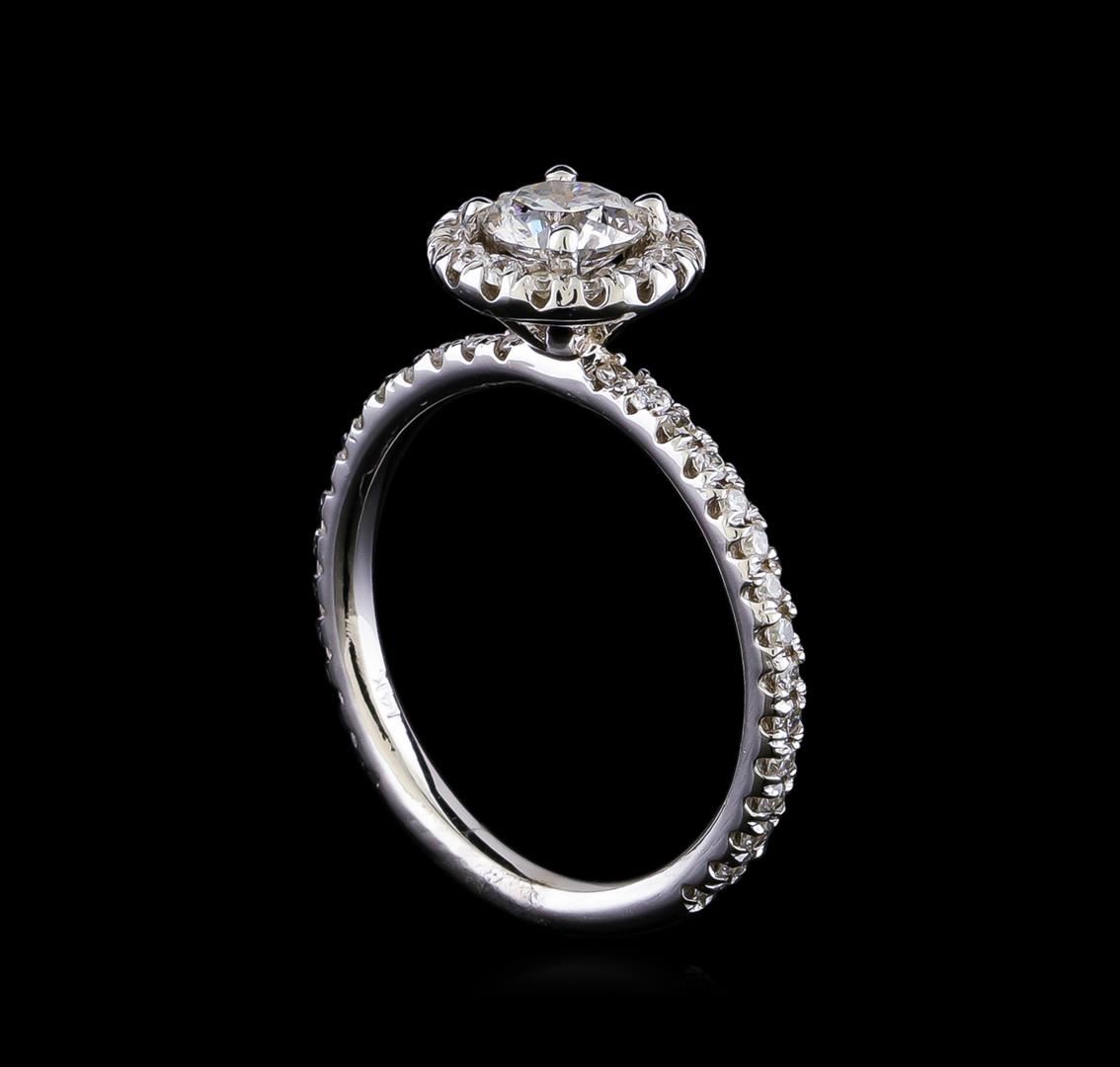 One electronically tested 14KT white gold lady's cast wedding ring with a halo with a bright polish finish. The featured lady's ring has a shank measuring 1.92 millimeters in width. Identified with markings of "14K". Condition is new, good workmanship. Containing: One prong set round brilliant cut diamond, measuring 5.49 - 5.41 x 3.49mm (depth est.) approximate weight of 0.64ct. Graded in the setting. Clarity: SI-2. Color: I. Cut Good Forty-Six prong set round brilliant cut diamonds, measuring 1.40 - 1.35 x 0.84mm (depth est.) approximate total weight of 46 Stones = 0.44ct. Graded in the setting. Clarity: VS-2 to SI-2. Color: G - Good. Total Weight of Diamonds 1.08ct. Total Weight of Ring 3.00gm. GAS Appraised.