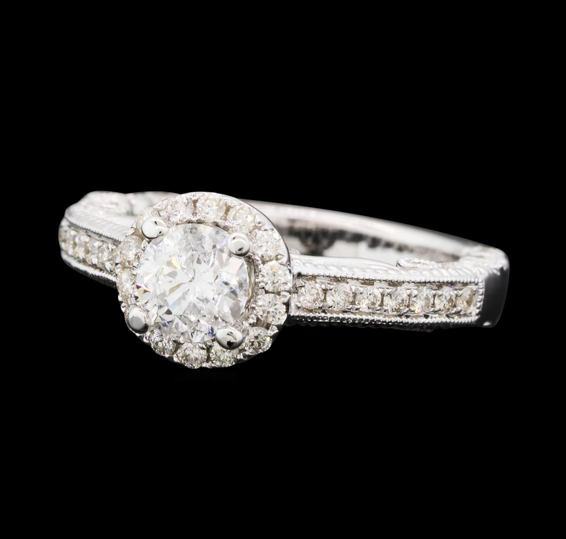 One electronically tested 14KT white gold lady's cast wedding ring with a cathedral halo with a bright polish with milgrain detailing finish. The featured lady's ring has a scrolled side gallery and a shank measuring 2.77 millimeters wide. Identified with markings of '14K'. Condition is new, good workmanship. Containing: One prong set round brilliant cut diamond, measuring 5.64 - 5.62 x 3.49mm (depth est.) approximate weight of 0.69ct. Graded in the setting. Color G Clarity I-1 Cut Very Good Fourteen prong set round brilliant cut diamonds, measuring 1.60 - 1.50 x 0.96mm (depth est.) approximate total weight of 14 Stones = 0.20ct. Graded in the setting. Color H - I Clarity SI-1 to SI-2 Cut Good Twenty-Eight prong set round brilliant cut diamonds, measuring 1.30 - 1.10 x 0.74mm (depth est.) approximate total weight of 28 Stones = 0.19ct. Graded in the setting. Color H - I Clarity SI-1 to I-1 Cut Good. Total Weight of Diamonds 1.08ct.. Total Weight of Ring 5.40gm GAS Appraised.