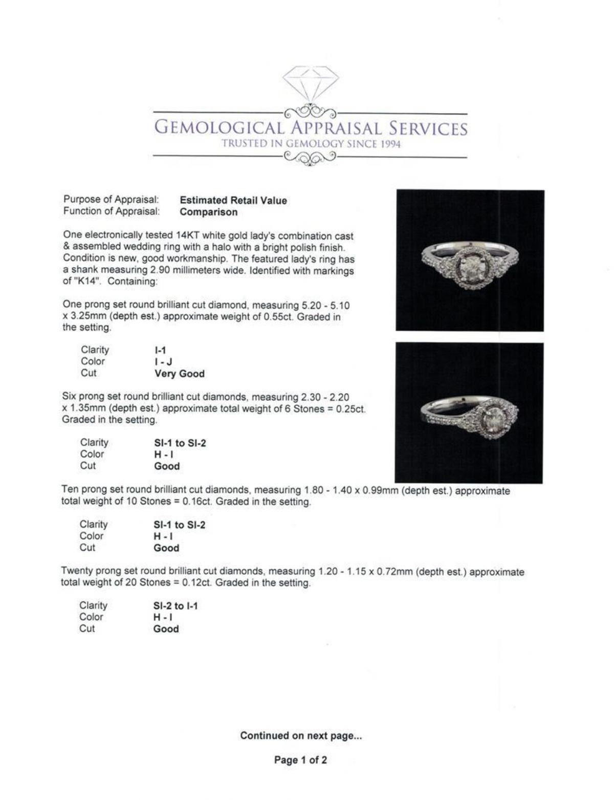 One electronically tested 14KT white gold lady's combination cast & assembled wedding ring with a halo with a bright polish finish. The featured lady's ring has a shank measuring 2.90 millimeters wide. Identified with markings of 'K14'. Condition is new, good workmanship. Containing: One prong set round brilliant cut diamond, measuring 5.20 - 5.10 x 3.25mm (depth est.) approximate weight of 0.55ct. Graded in the setting. Clarity I-1. Color: I - J Cut Very Good Six prong set round brilliant cut diamonds, measuring 2.30 - 2.20 x 1.35mm (depth est.) approximate total weight of 6 Stones = 0.25ct. Graded in the setting. Clarity SI-1 to SI-2. Color: H - I Cut Good Ten prong set round brilliant cut diamonds, measuring 1.80 - 1.40 x 0.99mm (depth est.) approximate total weight of 10 Stones = 0.16ct. Graded in the setting. Clarity SI-1 to SI-2. Color: H - I Cut Good Twenty prong set round brilliant cut diamonds, measuring 1.20 - 1.15 x 0.72mm (depth est.) approximate total weight of 20 Stones = 0.12ct. Graded in the setting. Clarity SI-2 to I-1. Color: H - I Cut Good. Total Weight of Diamonds 1.08ct.. Total Weight of Ring 4.30gm. GAS Appraised.