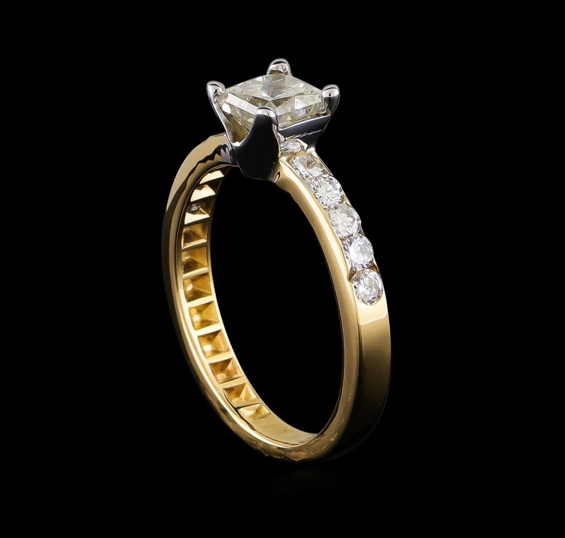 One electronically tested 14KT yellow gold ladies cast diamond unity ring. The featured diamond is supported by diamond ribbon shoulders, completed by a two millimeter wide band. Bright polish finish with rhodium accents. Condition is new, good workmanship. Containing: One prong set princess cut diamond, measuring 4.80 x 4.70 x 3.70mm (depth est.) approximate weight of 0.68ct. Graded in the setting. Clarity: I-2. Color: K. Depth 78.7%. Table 74.5%. Ten channel set round brilliant cut diamonds, measuring 2.20 - 2.20 x 1.32mm (depth est.) approximate total weight of 10 Stones = 0.40ct. Graded in the setting. Clarity: SI-1 to I-1. Color: G - I. Total Weight of Diamonds 1.08ct. Total Weight of Ring 2.65gm. AIG Appraised at $3,320.00.