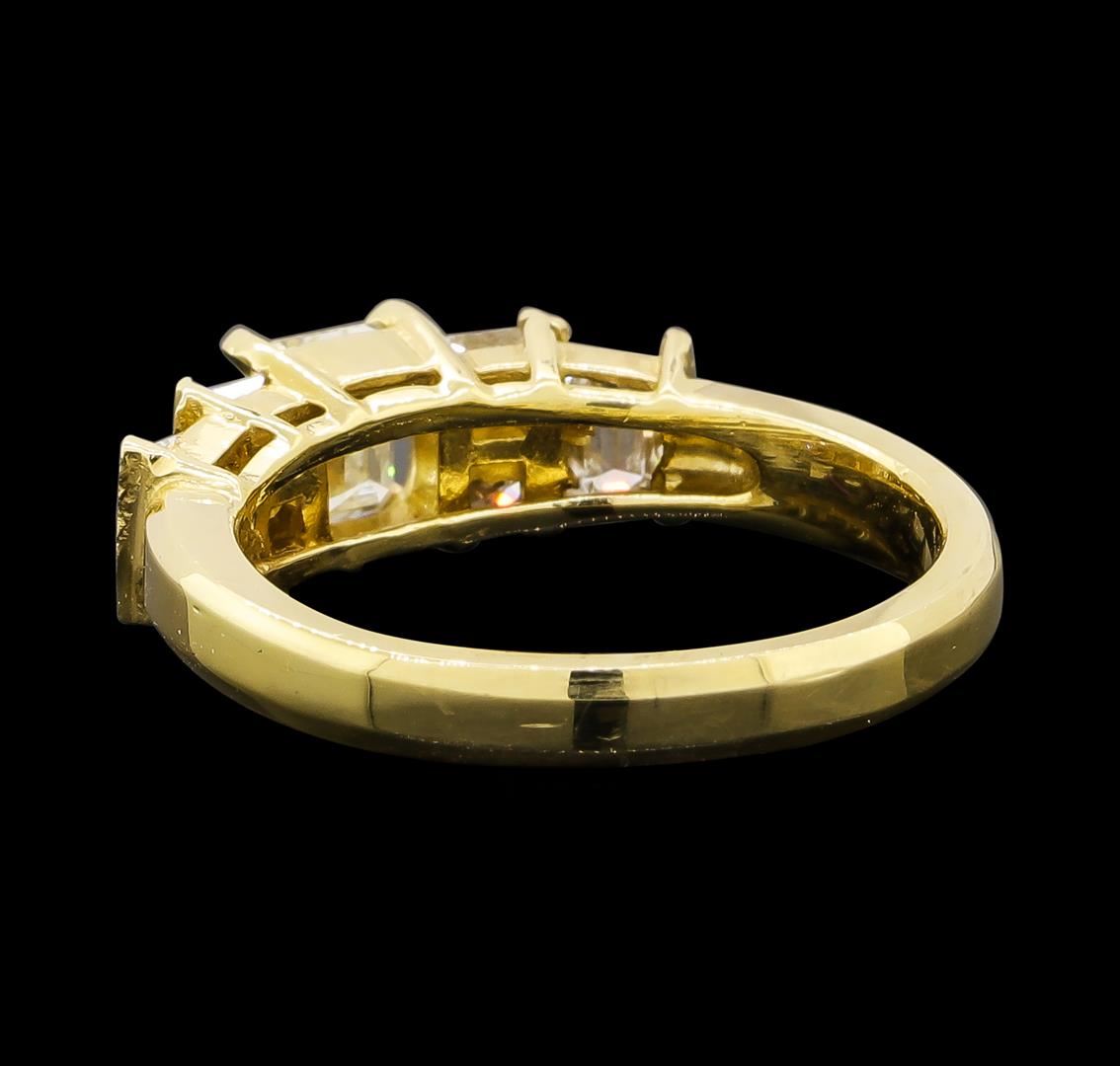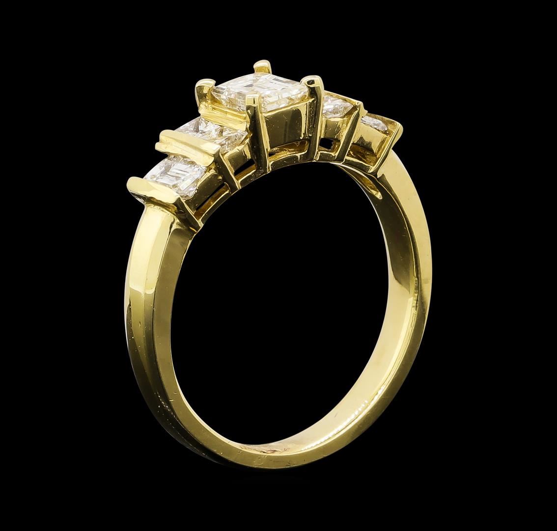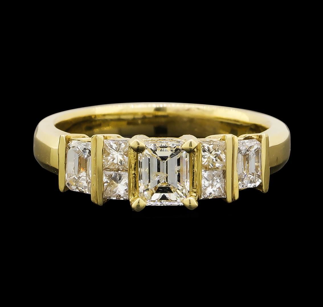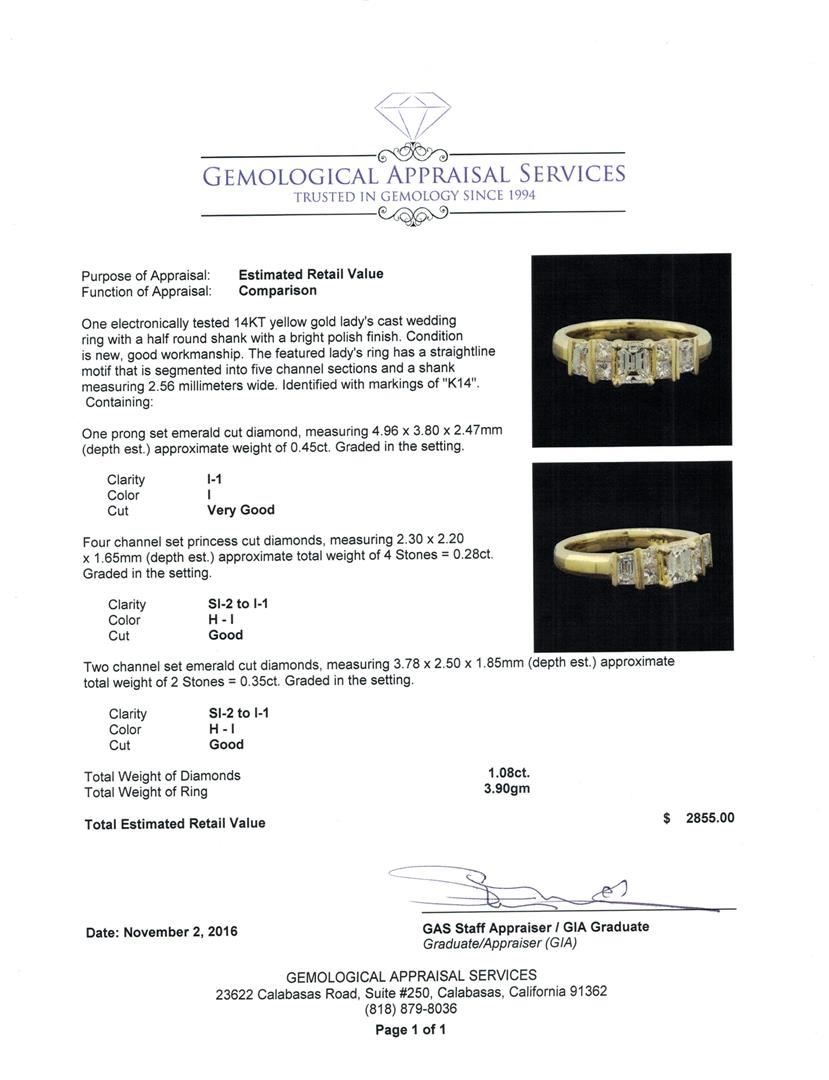 One electronically tested 14KT yellow gold lady's cast wedding ring with a half round shank with a bright polish finish. The featured lady's ring has a straight line motif that is segmented into five channel sections and a shank measuring 2.56 millimeters wide. Identified with markings of 'K14'. Condition is new, good workmanship. Containing: One prong set emerald cut diamond, measuring 4.96 x 3.80 x 2.47mm (depth est.) approximate weight of 0.45ct. Graded in the setting. Clarity I-1. Color: I Cut Very Good Four channel set princess cut diamonds, measuring 2.30 x 2.20 x 1.65mm (depth est.) approximate total weight of 4 Stones = 0.28ct. Graded in the setting. Clarity SI-2 to I-1. Color: H - I Cut Good Two channel set emerald cut diamonds, measuring 3.78 x 2.50 x 1.85mm (depth est.) approximate total weight of 2 Stones = 0.35ct. Graded in the setting. Clarity SI-2 to I-1. Color: H - I Cut Good. Total Weight of Diamonds 1.08ct.. Total Weight of Ring 3.90gm. GAS Appraised at $2,855.00.