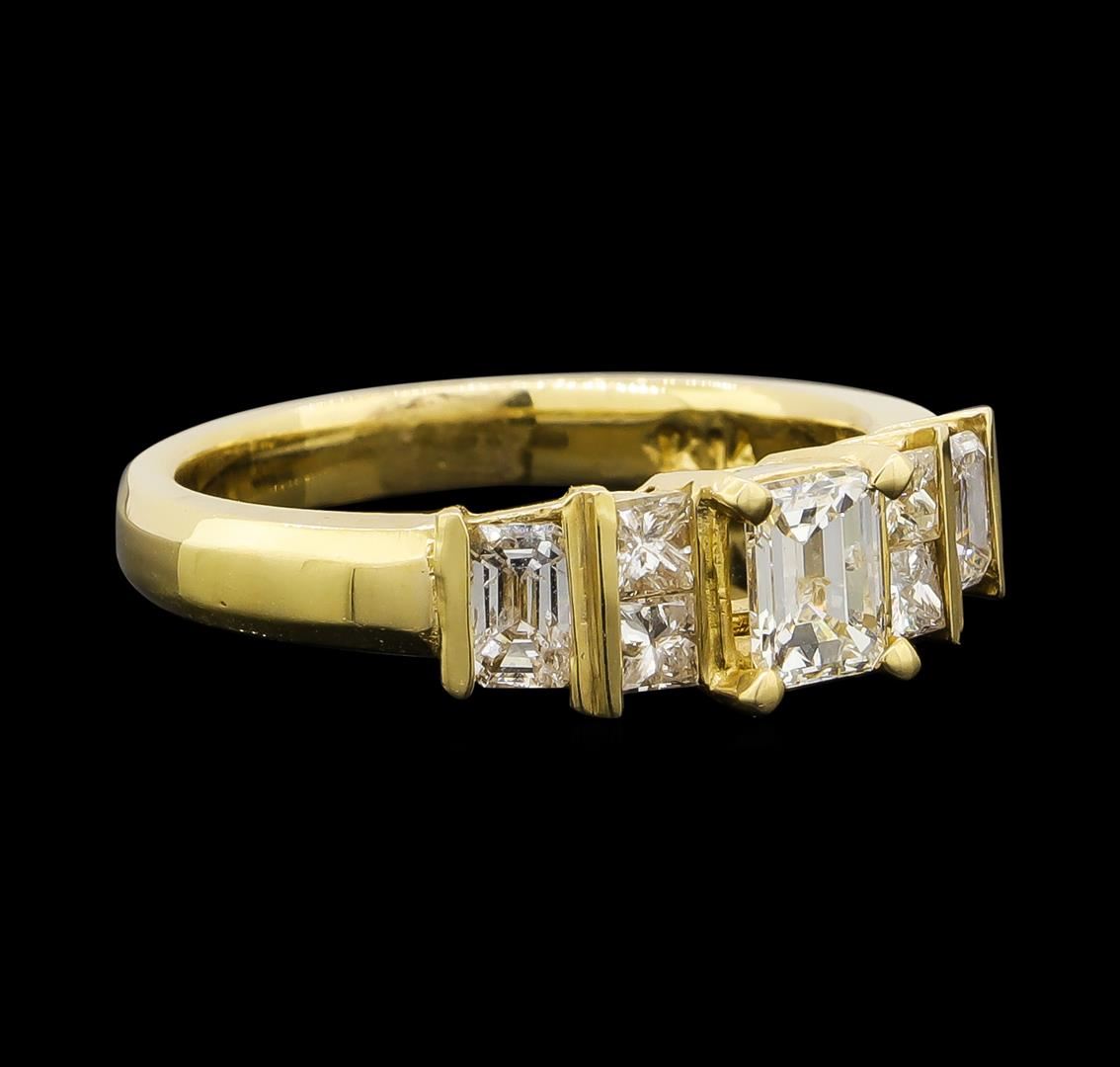 One electronically tested 14KT yellow gold lady's cast wedding ring with a half round shank with a bright polish finish. The featured lady's ring has a straight line motif that is segmented into five channel sections and a shank measuring 2.56 millimeters wide. Identified with markings of 'K14'. Condition is new, good workmanship. Containing: One prong set emerald cut diamond, measuring 4.96 x 3.80 x 2.47mm (depth est.) approximate weight of 0.45ct. Graded in the setting. Clarity I-1. Color: I Cut Very Good Four channel set princess cut diamonds, measuring 2.30 x 2.20 x 1.65mm (depth est.) approximate total weight of 4 Stones = 0.28ct. Graded in the setting. Clarity SI-2 to I-1. Color: H - I Cut Good Two channel set emerald cut diamonds, measuring 3.78 x 2.50 x 1.85mm (depth est.) approximate total weight of 2 Stones = 0.35ct. Graded in the setting. Clarity SI-2 to I-1. Color: H - I Cut Good. Total Weight of Diamonds 1.08ct.. Total Weight of Ring 3.90gm. GAS Appraised at $2,855.00.