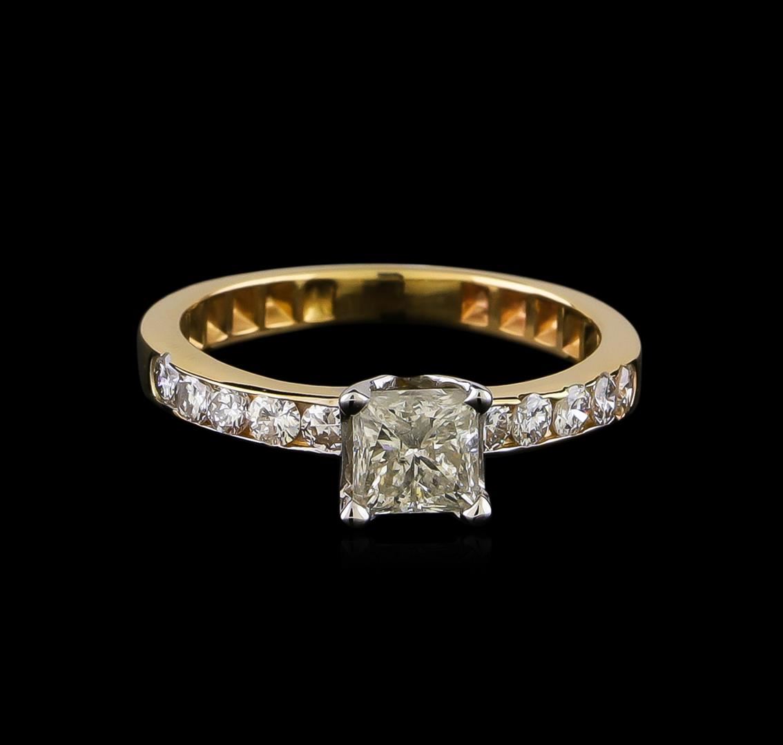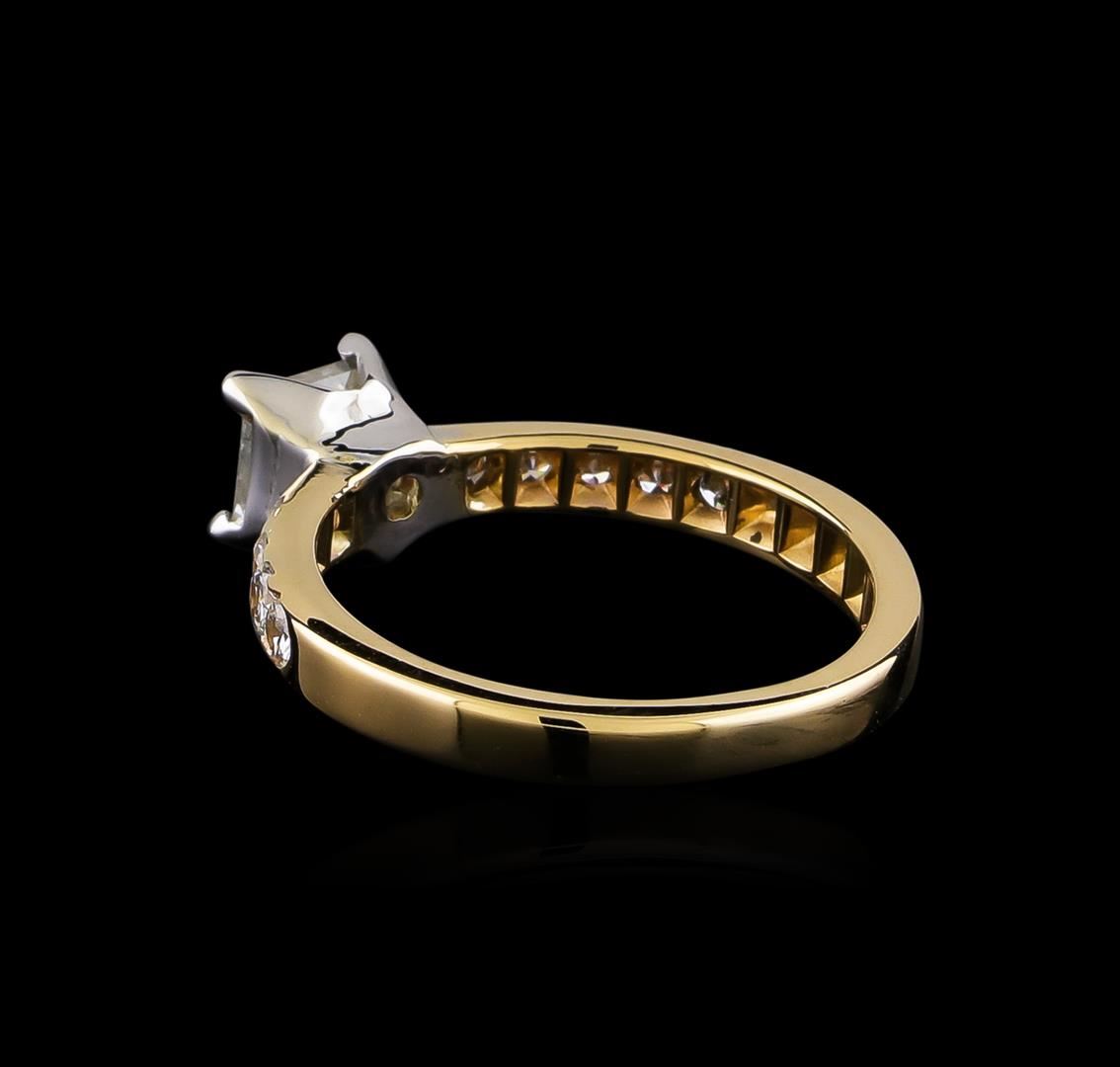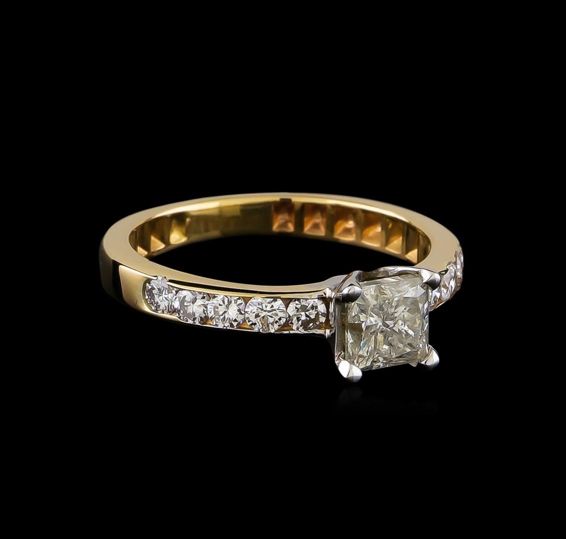 One electronically tested 14KT yellow gold ladies cast diamond unity ring. The featured diamond is supported by diamond ribbon shoulders, completed by a two millimeter wide band. Bright polish finish with rhodium accents. Condition is new, good workmanship. Containing: One prong set princess cut diamond, measuring 4.80 x 4.70 x 3.70mm (depth est.) approximate weight of 0.68ct. Graded in the setting. Clarity: I-2. Color: K. Depth 78.7%. Table 74.5%. Ten channel set round brilliant cut diamonds, measuring 2.20 - 2.20 x 1.32mm (depth est.) approximate total weight of 10 Stones = 0.40ct. Graded in the setting. Clarity: SI-1 to I-1. Color: G - I. Total Weight of Diamonds 1.08ct. Total Weight of Ring 2.65gm. AIG Appraised at $3,320.00.
