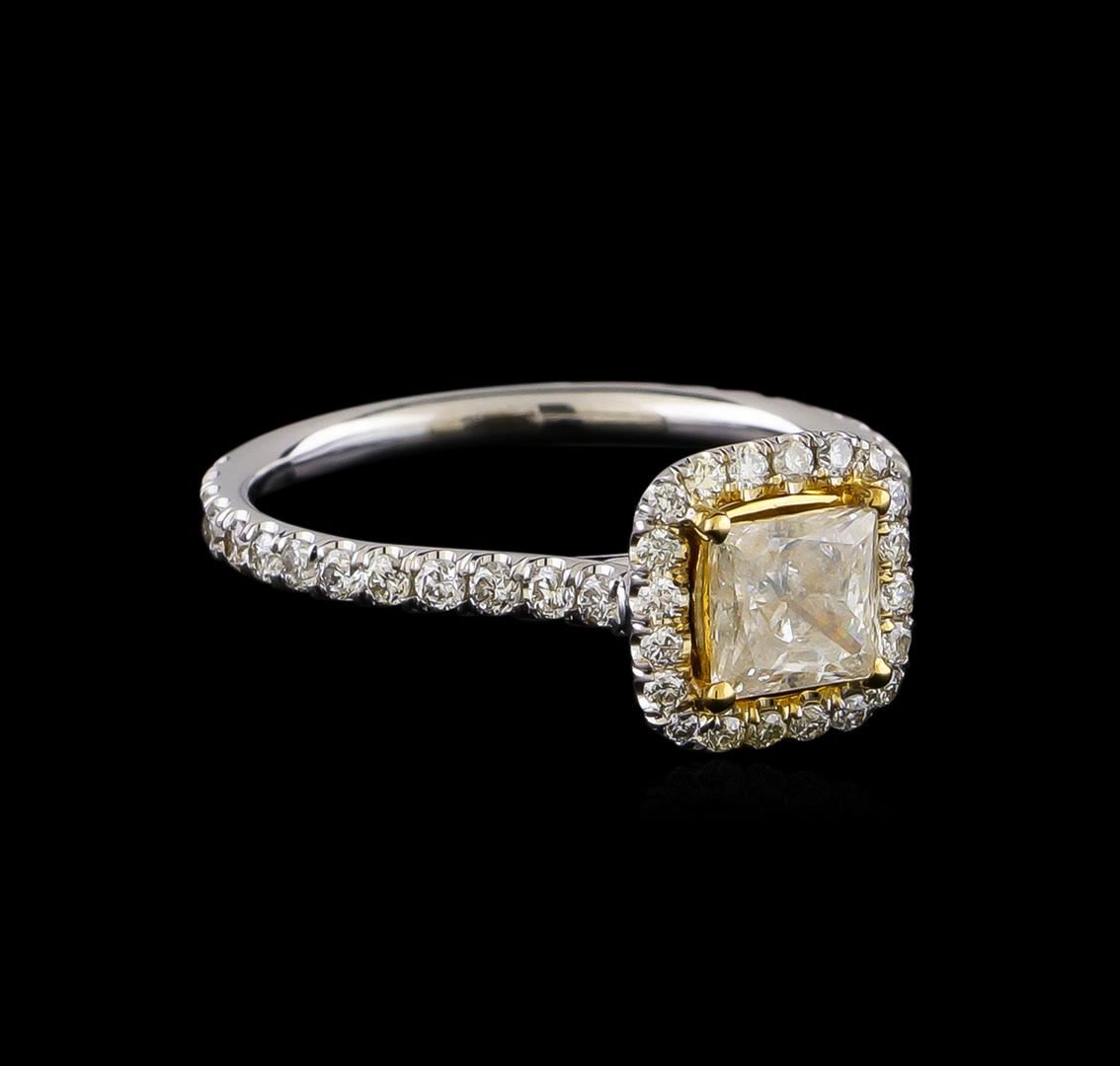 One electronically tested 18KT white gold ladies cast diamond unity ring. The featured diamond is set within an inner yellow gold basket and outer white gold diamond bezel supported by diamond ribbon shoulders, completed by a one and one-half millimeter wide band. Bright polish finish with yellow gold accents. Condition is new, good workmanship. Containing: One prong set princess cut diamond, measuring 4.90 x 5.10 x 3.57mm (depth est.) approximate weight of 0.74ct with a faint blue fluorescence. Graded in the setting. Clarity: I-2. Color: I. Depth 70.0%. Table 76.5%. Twenty-Six prong set round brilliant cut diamonds, measuring 1.10 - 1.10 x 0.66mm (depth est.) approximate total weight of 26 Stones = 0.15ct. Color & clarity grade are an average for the group. Graded in the setting. Clarity: SI-2 to I-1. Color: H - I Twenty prong set round brilliant cut diamonds, measuring 1.30 - 1.20 x 0.75mm (depth est.) approximate total weight of 20 Stones = 0.19ct. Color & clarity grade are an average for the group. Graded in the setting. Clarity: SI-2 to I-1. Color: I - K. Total Weight of Diamonds 1.08ct. Total Weight of Ring 3.23gm. AIG Appraised at $4,510.00.
