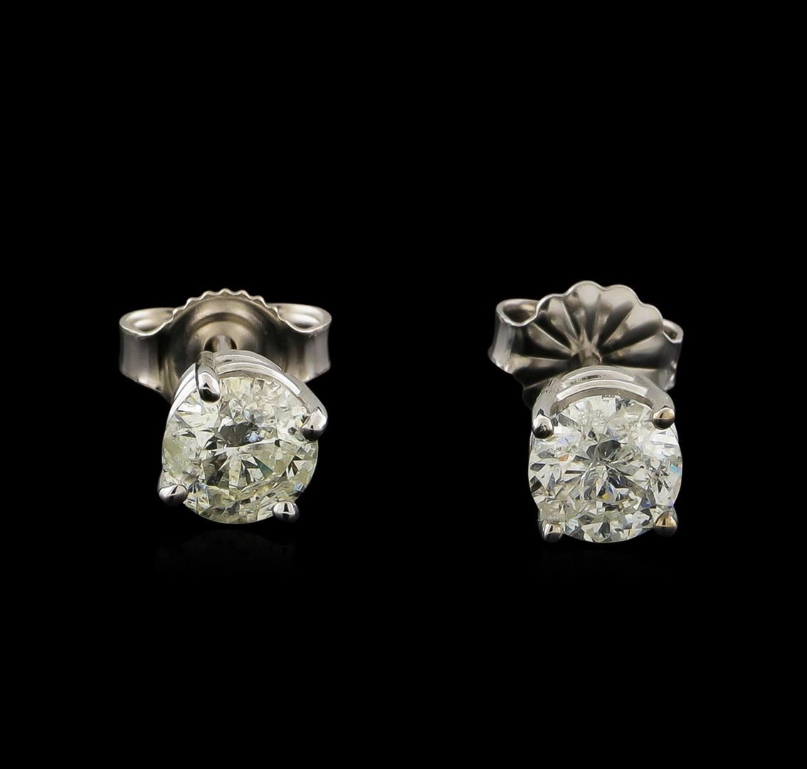 One pair electronically tested 14KT white gold cast & assembled diamond solitaire earrings with standard backs. Bright polish finish. Identified with markings of "14K". Condition is new, good workmanship. Containing: One prong set round brilliant cut diamond, measuring 5.10 - 5.05 x 3.30mm (depth est.) approximate weight of 0.51ct with a faint blue fluorescence. Graded in the setting. Clarity: I-2. Color: 65.0%. Table 57.1%. One prong set round brilliant cut diamond, measuring 5.00 - 5.00 x 3.80mm (depth est.) approximate weight of 0.57ct. Naturally occurring internal & external characteristics are present, including surface reaching feathers. Graded in the setting. Clarity: I-3. Color: 76.0%. Table 58.0%. Total Weight of Diamonds 1.08ct. Total Weight of Earrings 1.07gm. AIG Appraised at $2,935.00.