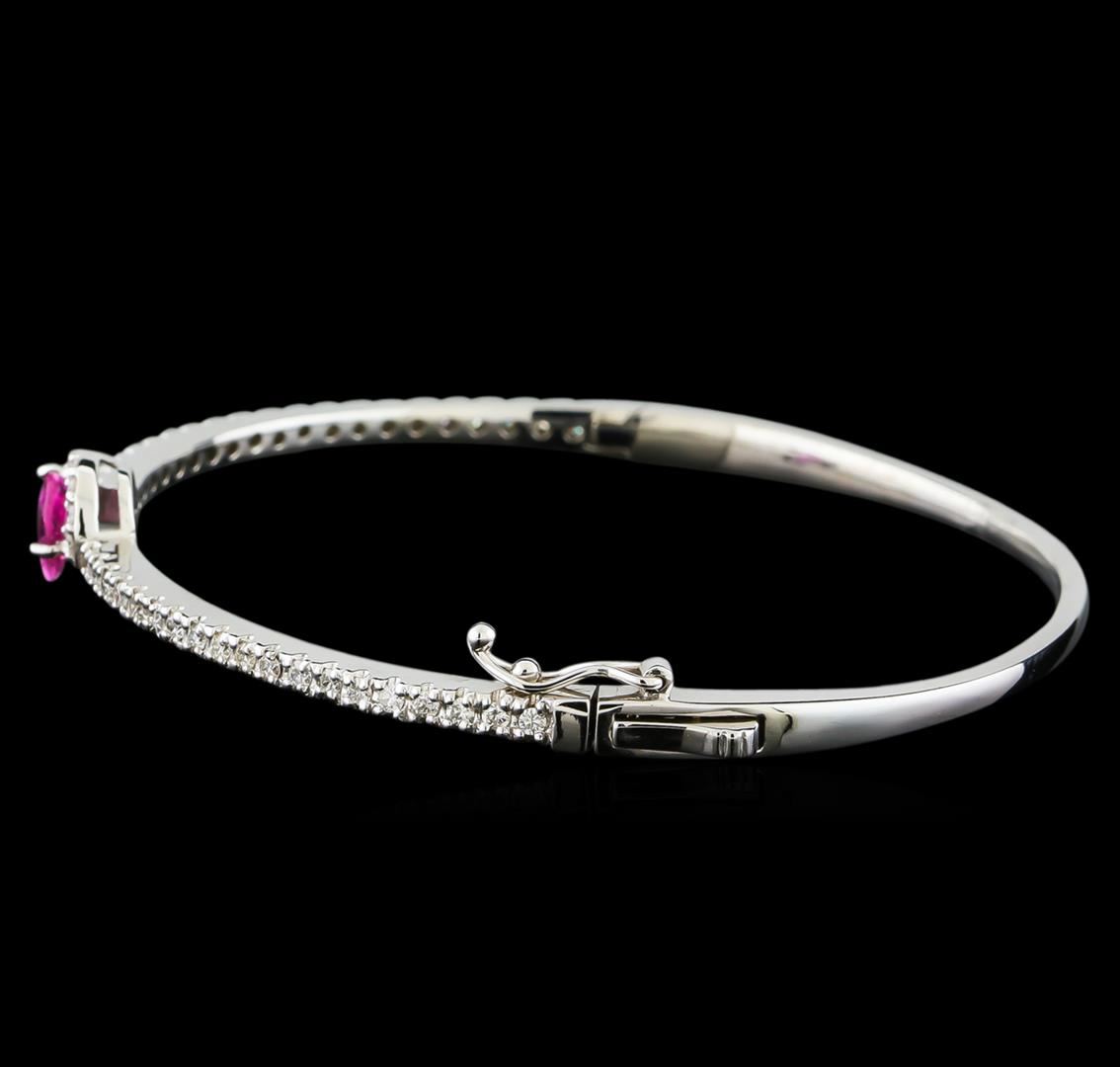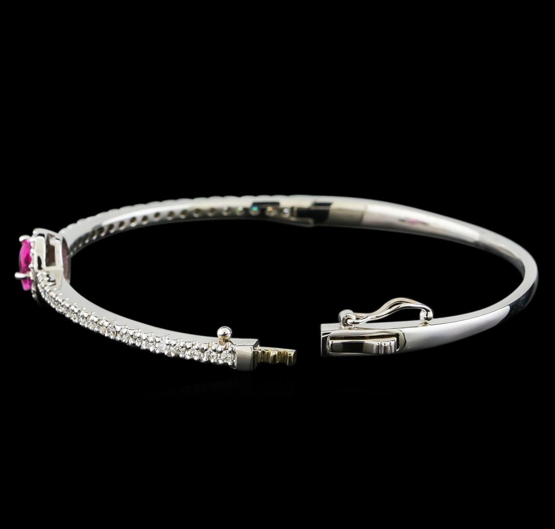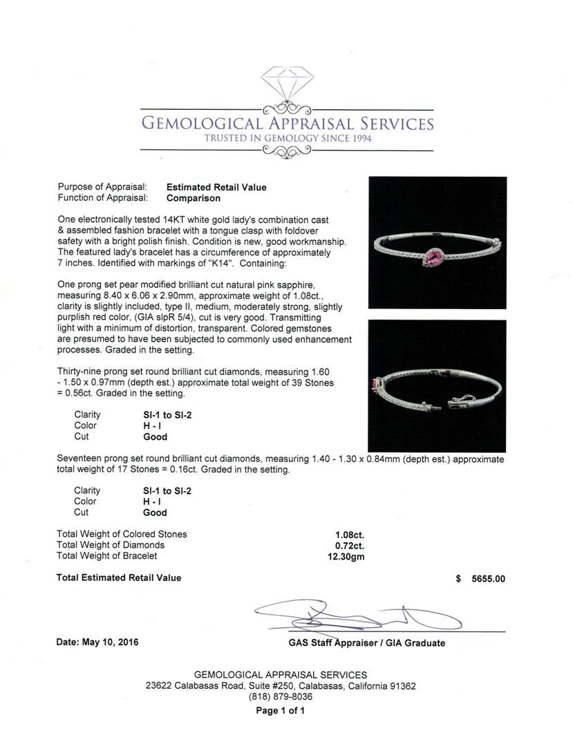 One electronically tested 14KT white gold lady's combination cast & assembled fashion bracelet with a tongue clasp with foldover safety with a bright polish finish. The featured lady's bracelet has a circumference of approximately 7 inches. Identified with markings of "K14". Condition is new, good workmanship. Containing: One prong set pear modified brilliant cut natural pink sapphire, measuring 8.40 x 6.06 x 2.90mm, approximate weight of 1.08ct., clarity is slightly included, type II, medium, moderately strong, slightly purplish red color, (GIA slpR 5/4), cut is very good. Transmitting light with a minimum of distortion, transparent. Colored gemstones are presumed to have been subjected to commonly used enhancement processes. Graded in the setting. Thirty-Nine prong set round brilliant cut diamonds, measuring 1.60 - 1.50 x 0.97mm (depth est.) approximate total weight of 39 Stones = 0.56ct. Graded in the setting. Clarity: SI-1 to SI-2. Color: H - I. Cut Good Seventeen prong set round brilliant cut diamonds, measuring 1.40 - 1.30 x 0.84mm (depth est.) approximate total weight of 17 Stones = 0.16ct. Graded in the setting. Clarity: SI-1 to SI-2. Color: H - I. Cut Good. Total Weight of Colored Stones 1.08ct. Total Weight of Diamonds 0.72ct. Total Weight of Bracelet 12.30gm. GAS Appraised at $5,655.00.