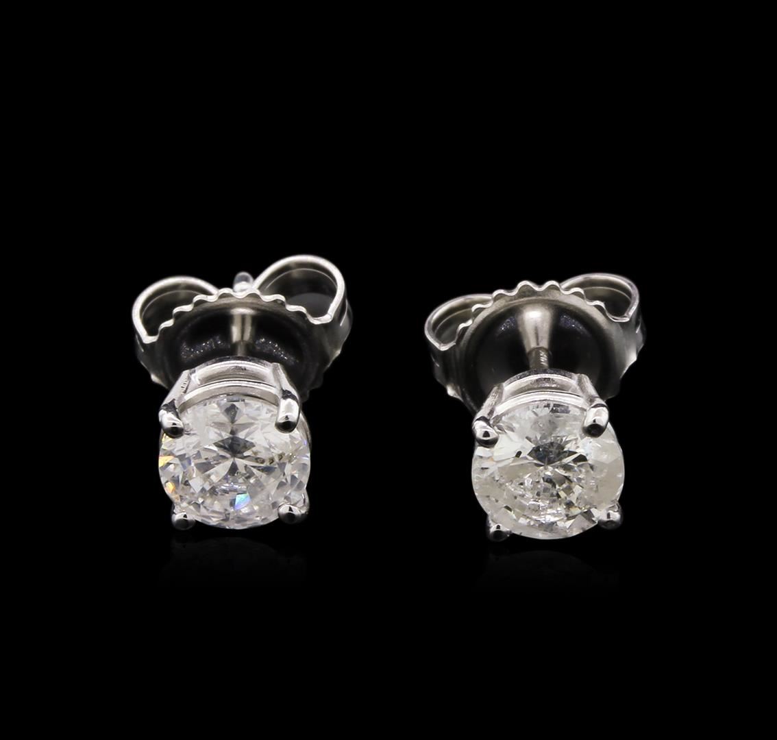 One pair electronically tested 14KT white gold cast & assembled diamond solitaire earrings with standard backs. Identified with markings of "14K". Condition is new, good workmanship. Containing: One prong set round brilliant cut diamond, measuring 5.20 - 5.20 x 3.20mm (depth est.), 5.00% GTCF approximate weight of 0.55ct with a faint blue fluorescence. Graded in the setting. Clarity: I-2. Color: H. Depth 61.5%. Table 63.5%. One prong set round brilliant cut diamond, measuring 5.30 - 5.30 x 3.10mm (depth est.) approximate weight of 0.53ct. Graded in the setting. Clarity: I-2. Color: I. Depth 58.5%. Table 62.3%. Total Weight of Diamonds 1.08ct. Total Weight of Earrings 1.22gm. AIG Appraised at $3,990.00.