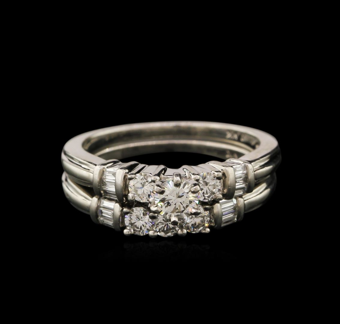 One electronically tested platinum ladies cast diamond engagement ring & wedding band with a bright polish finish. Identified with markings of "PT 900". Condition is new. Containing: One prong set round brilliant cut diamond, measuring 4.00 - 4.00 x 2.40mm (depth est.) approximate weight of 0.24ct. Clarity: VS-2. Color: J, Cut is Good. Five prong set round brilliant cut diamonds, measuring 2.90 - 2.90 x 1.74mm (depth est.) approximate total weight of 5 Stones = 0.50ct. Clarity: SI-1. Color: J, Cut is Good. Twelve channel set baguette cut diamonds, measuring 2.00 x 1.50 x 1.28mm (depth est.) approximate total weight of 12 Stones = 0.34ct. Clarity: SI-1. Color: I - J, Cut is Good. Diamonds are graded in the mounting, unless otherwise stated. Total Weight of Diamonds 1.08ct. Total Weight of Engagement Ring & Wedding Band 7.60 grams. GGL Appraised at $3,680.00.