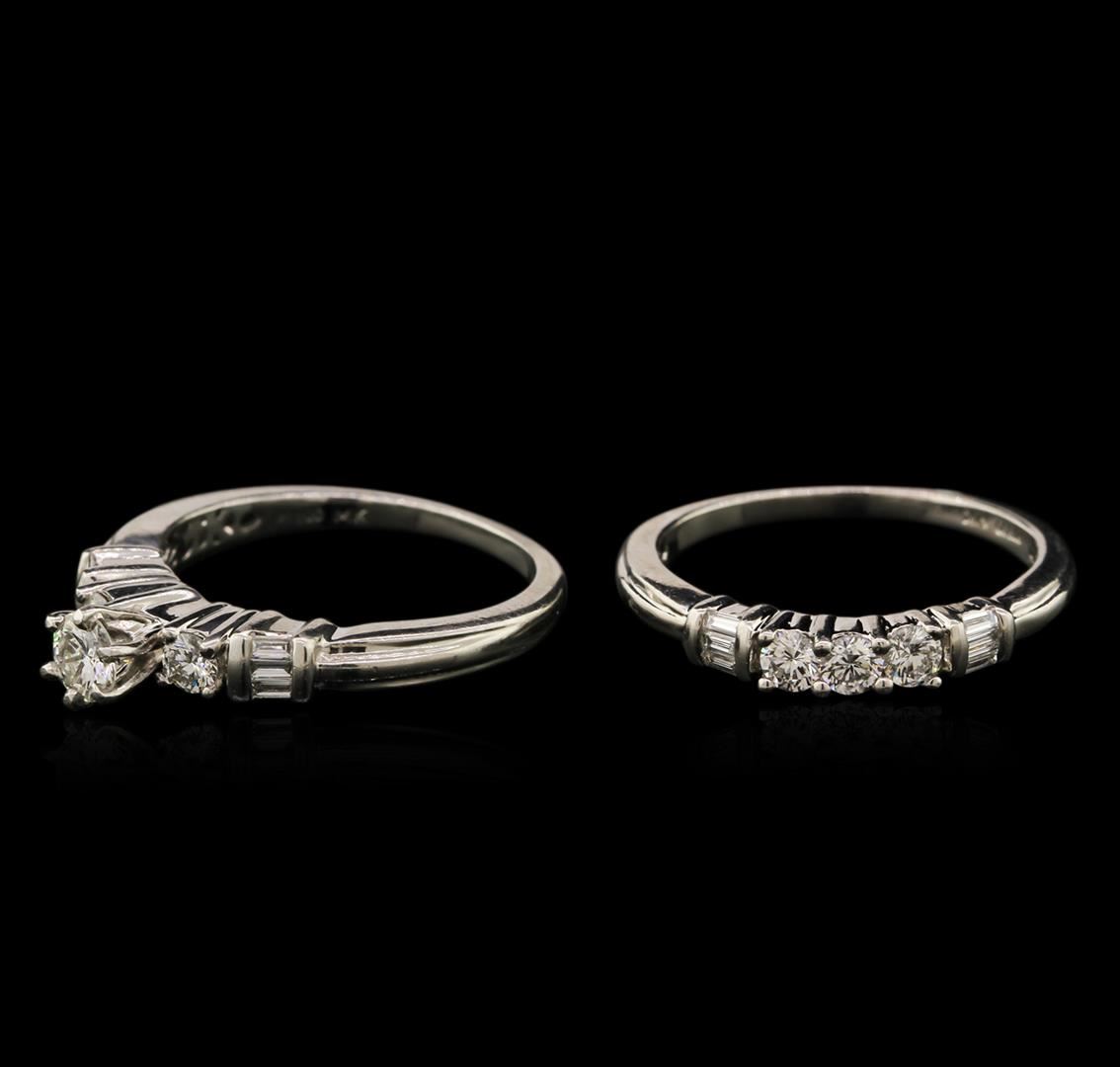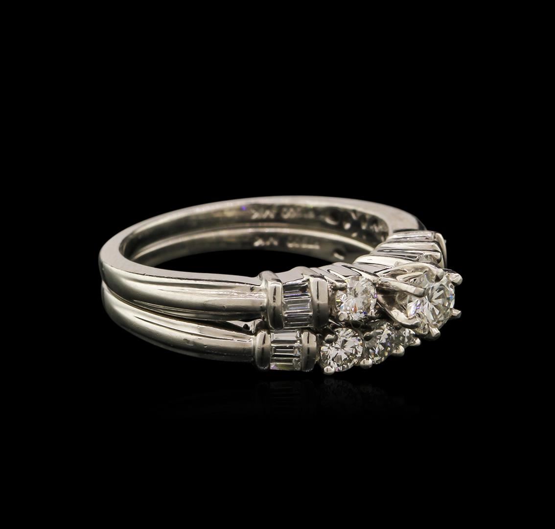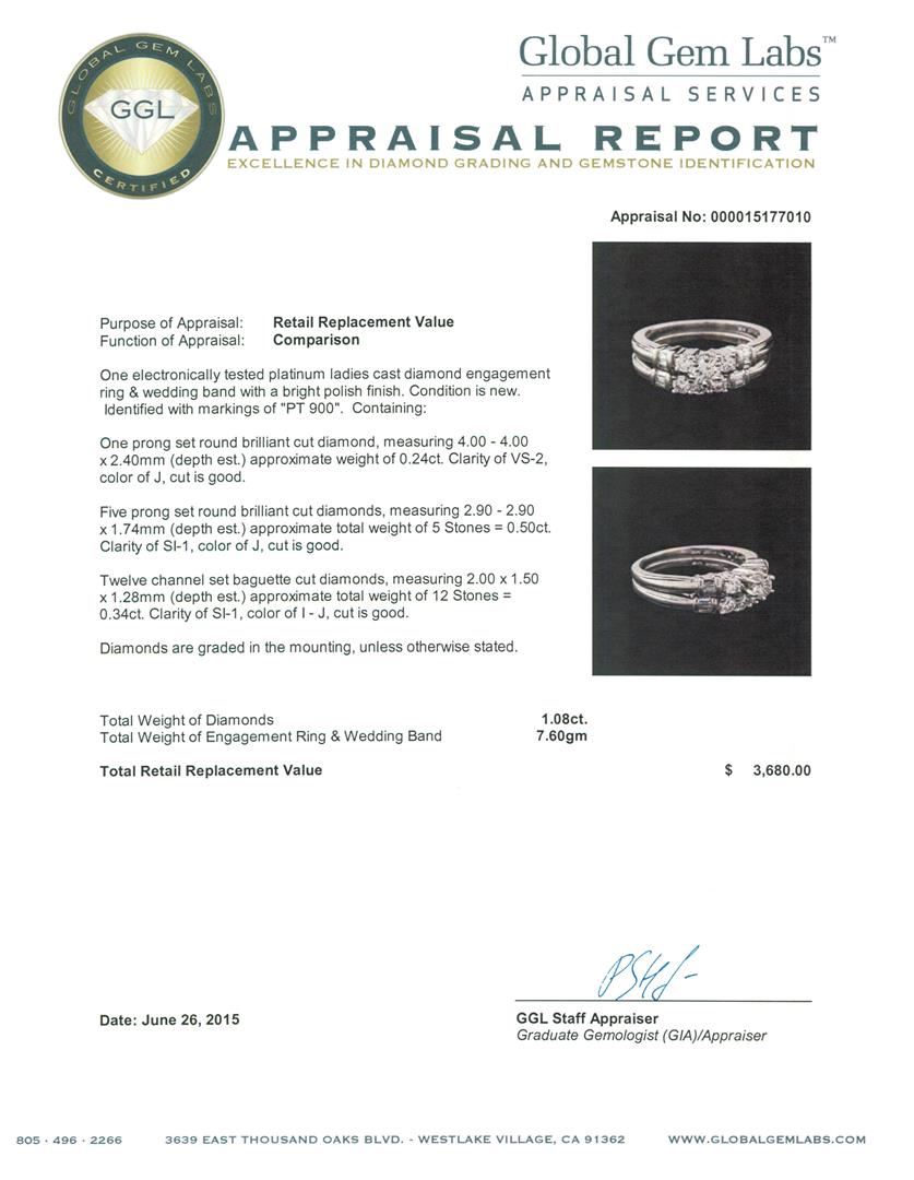 One electronically tested platinum ladies cast diamond engagement ring & wedding band with a bright polish finish. Identified with markings of "PT 900". Condition is new. Containing: One prong set round brilliant cut diamond, measuring 4.00 - 4.00 x 2.40mm (depth est.) approximate weight of 0.24ct. Clarity: VS-2. Color: J, Cut is Good. Five prong set round brilliant cut diamonds, measuring 2.90 - 2.90 x 1.74mm (depth est.) approximate total weight of 5 Stones = 0.50ct. Clarity: SI-1. Color: J, Cut is Good. Twelve channel set baguette cut diamonds, measuring 2.00 x 1.50 x 1.28mm (depth est.) approximate total weight of 12 Stones = 0.34ct. Clarity: SI-1. Color: I - J, Cut is Good. Diamonds are graded in the mounting, unless otherwise stated. Total Weight of Diamonds 1.08ct. Total Weight of Engagement Ring & Wedding Band 7.60 grams. GGL Appraised at $3,680.00.