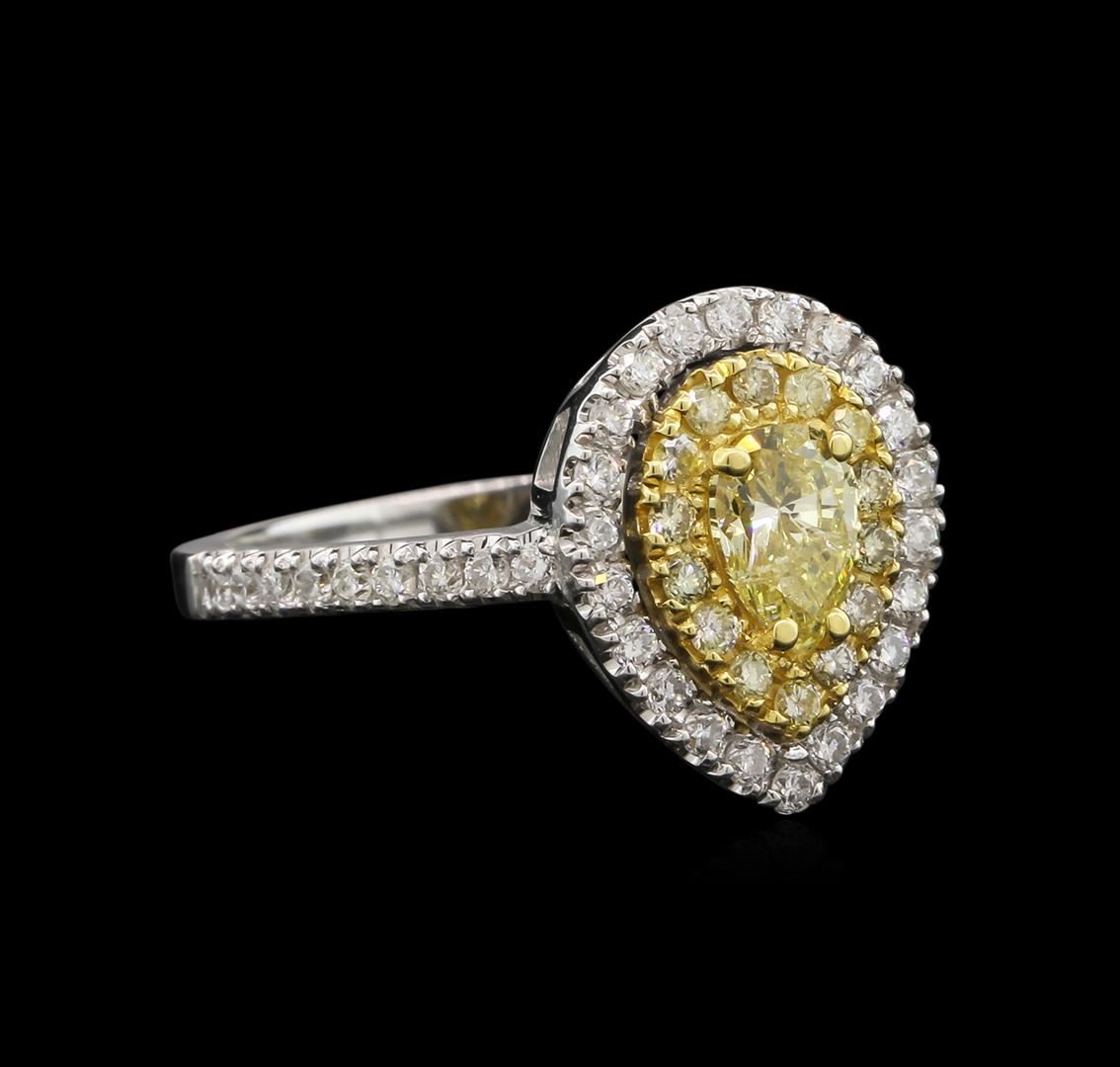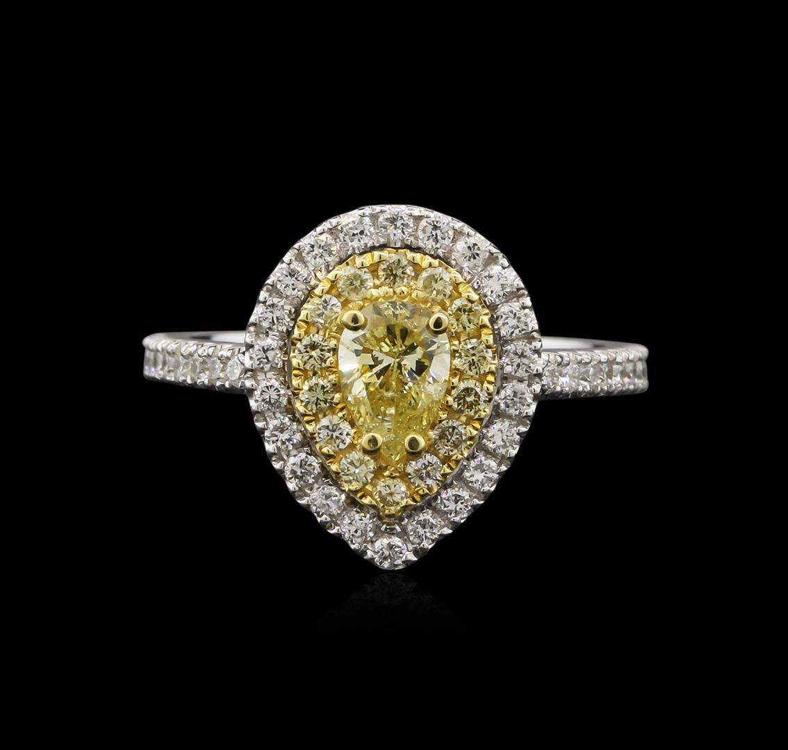 One ring featuring: 14KT white gold weighing 4.34 grams containing one prong set pear shape fancy yellow diamond center stone with a total weight of 0.47ct, prong set round white diamonds with a total weight of 0.43ct and prong set round yellow diamonds with a total weight of 0.18ct.