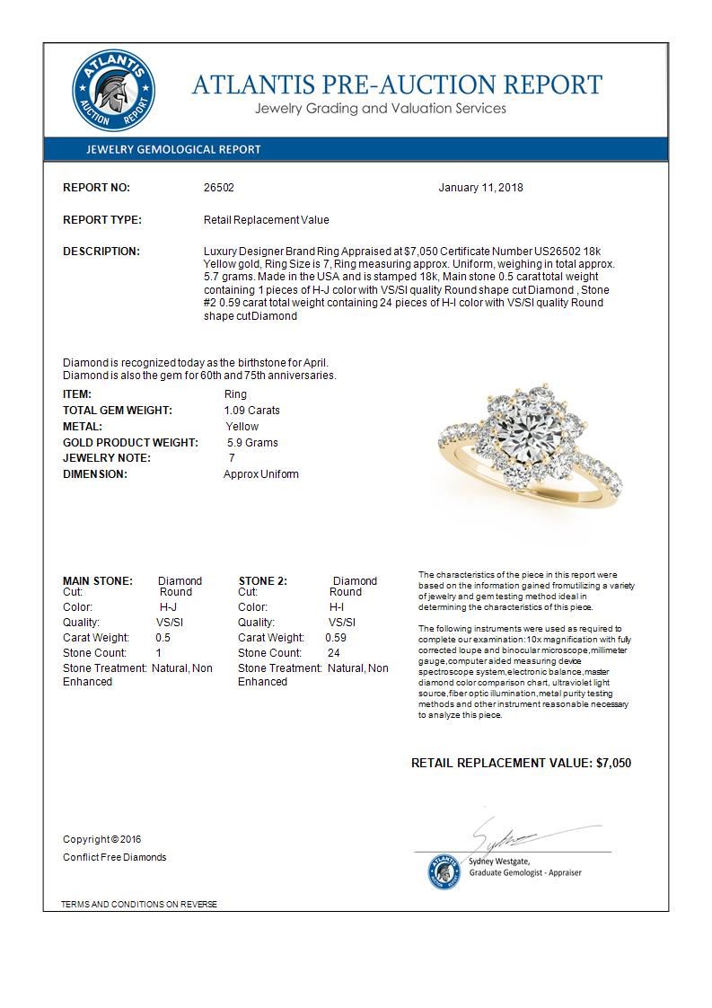 REF-142F2N -26502 ---- 1.09 CTW Certified VS/SI Diamond Solitaire Halo Ring 18K Yellow Gold ---- Luxury Designer Brand Ring Appraised at $7,050 Certificate Number US26502 18k Yellow gold, Ring Size is 7, Ring measuring approx. Uniform, weighing in total approx. 5.7 grams. Made in the USA and is stamped 18k, Main stone 0.5 carat total weight containing 1 pieces of H-J color with VS/SI quality Round shape cut Diamond , Stone #2 0.59 carat total weight containing 24 pieces of H-I color with VS/SI quality Round shape cut Diamond